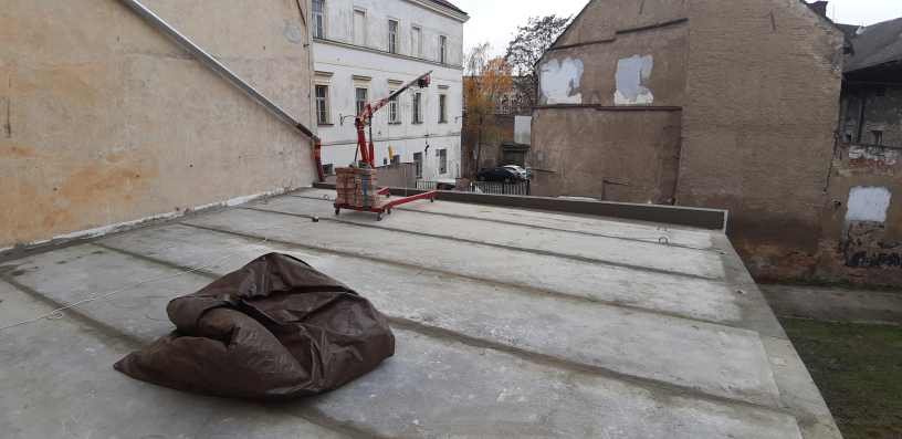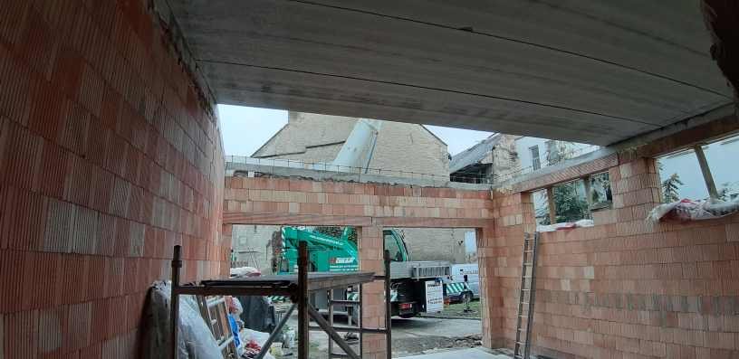 A tady je výsledek - žirafu na zvedání motorů jsme na jednom konci doplnili o cihelnou protiváhu a na druhém o dlouhou trubku volně zasunutou do ramene, na to malej elektrickej vrátek, a plná kolečka mohla začít jezdit z dvoumužné betonárky v přízemí na střechu. Začal jsme v 8:30, a s drobnou pauzou, kdy ti co makají si dali oběd, a já místo oběda rychou otočku do Hornbachu, protože došel beton. Ve 21:30 bylo dobetonováno, dnes z velké části odbedněno a doškrabáno do roviny.