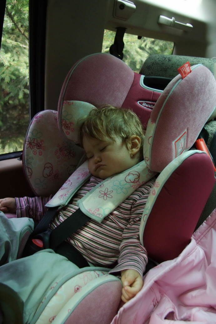 To vůbec není problém, na našich kvalitních silnicích poskakuje každé auto. Chce to akorát pořádnou autosedačku pro prcka. Přikládám fotku z loňských Valašských kotár - dokud se nejelo, nebo se jelo pomalu, tak koukala, ale jak to začlo houpat, tak okamžitě usnula a spala až do další zastávky, kde se přebalovalo. Neklan to měl perfektně načasované. Tehdy jí bylo necelých 13 měsíců.