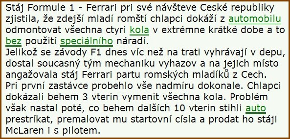 To mi něco připomíná... Že by mojí visco a kardany u té samé firmy??? Nic si z toho nedělej, já čekal rok a něco...fugín píše:Nevím kam s tím,tak to šoupnu sem. Není mým zvykem si stěžovat,ale myslím že by tohle mohlo varovat někoho kdo zrovna neoplývá trpělivostí. Tento týden ve středu ráno sem volal do autocentra Smrk na t.č. 608800667,sháněl sem jeden náhradní díl bez kterého dosud nejezdím. Bylo mě řečeno že asi mají ať zavolám za půl hodiny že to bude vědět určitě. Po půl hodině sem se dozvěděl že díl je ale že je ještě na autě s tím že ho demontují a hned se ozvou. Neozvali,volal sem tedy druhý den s tím že to potřebuju napevno vědět,poslal sem dokonce i dvě fota v MMS aby bylo jasno o co jde,dostalo se mě ujištění že příští den mě zavolají....zase prd,stejný scénář i včera ovšem s tím rozdílem že dnes to bude už na 100% a...zase kulový. Dokonce mě dotyčný dnes odpoledne na můj tel. dotaz řekl že (tam) půjde až v pondělí. Takže sem slušně další spolupráci odmítl,a vy kteří by ste náhodou dostali taky blbej nápad jako já tam pro něco volat tak radši volejte jinam,ušetříte za telefoun![]()