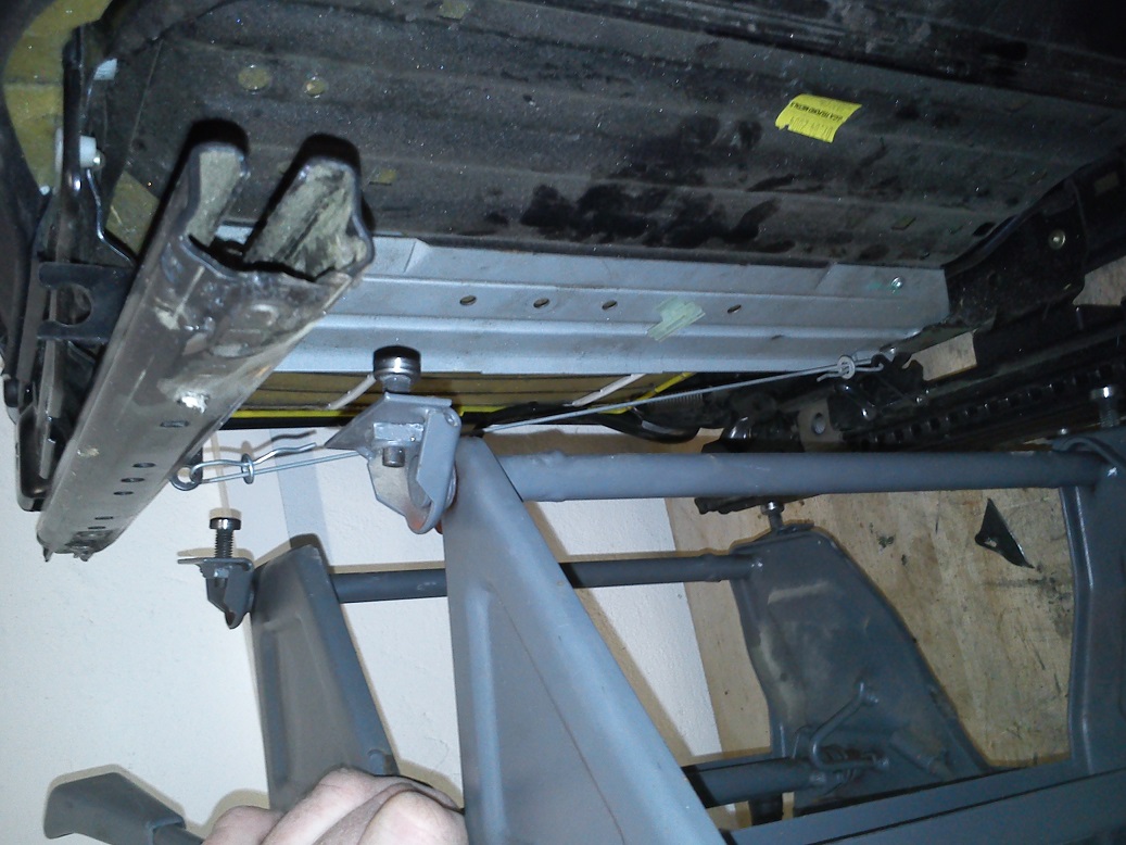 Na třídveřáku je ta koza pod sedačkou, takže jsem tam na dva šrouby chytil sedačku řidiče a podle ní si rozměřím umístění sedačky spolujezdce. Sedačku z D2 chytnu na tu sklápěcí konstrukci přes vingly, které si rozměřím a navařím na pojezdy novýho sedadla a pak sedačku našroubuju do úchytú na sklápěcí konstrukci.