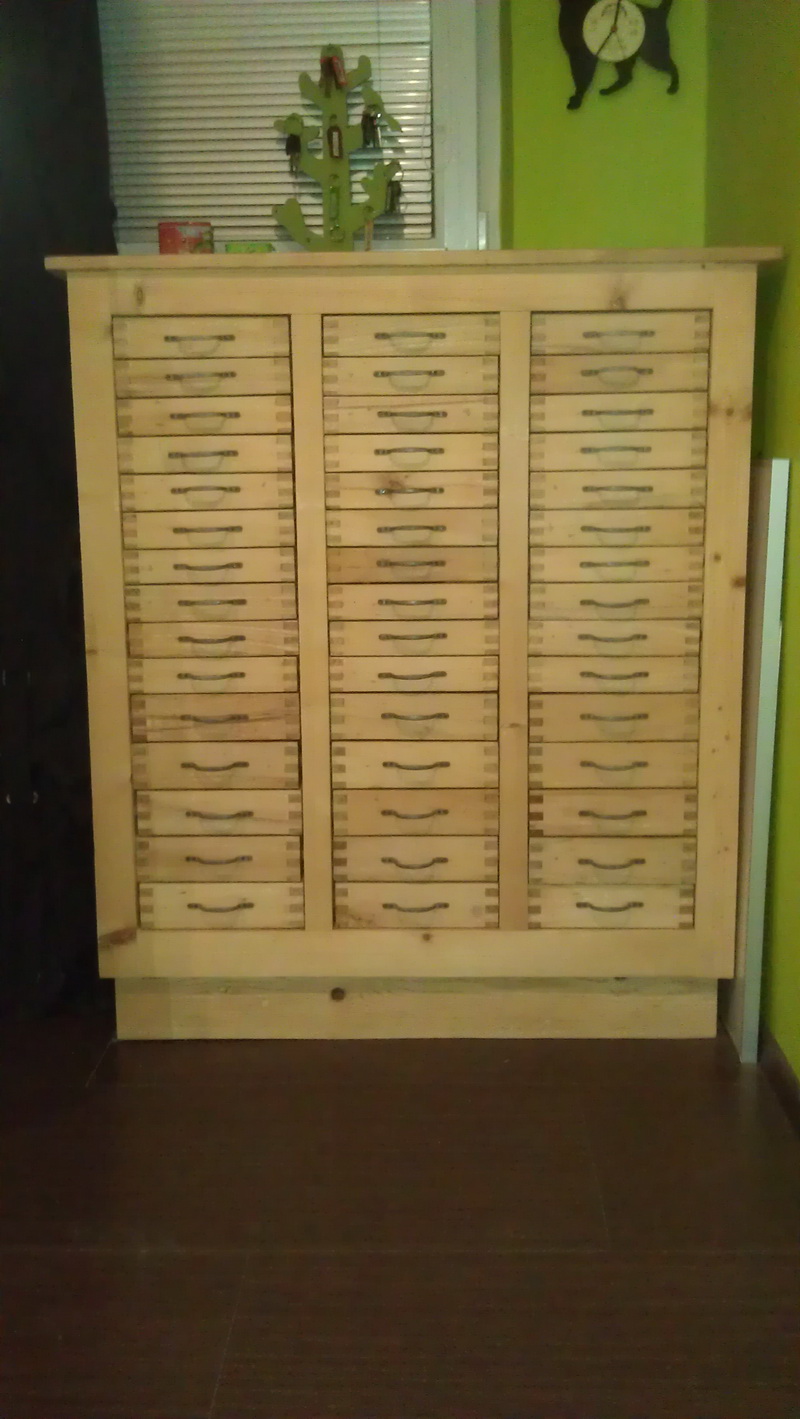Prodám skříňku - komodu, původně lékárenská nebo spisová, my jsme ji chtěli na archiv map a průvodců, ale chybí nám místo a tak ji prodáváme. Ideální na archivy, sbírky (menší předměty - hodinky, dýmky, nerosty, medaile, mince, brouci..), pro fajnšmekry i na nářadí třeba k veteránům. Perfektní stav, vyrobena ve 20.letech, celomasivní, bez povrchové úpravy - prošla louhováním, takže je úplně čistá. Vnější rozměry 94 x 54 x 108 cm (š x h x v), obsahuje 30x menší šuplík (vnitřní rozměr 19 x 43 x 4,5 cm) a 15x větší šuplík (vnitřní rozměr 19 x 43 x 6 cm). Původní cena v antiku 15.000,- Kč, chtěl bych za ní 10.000,-.