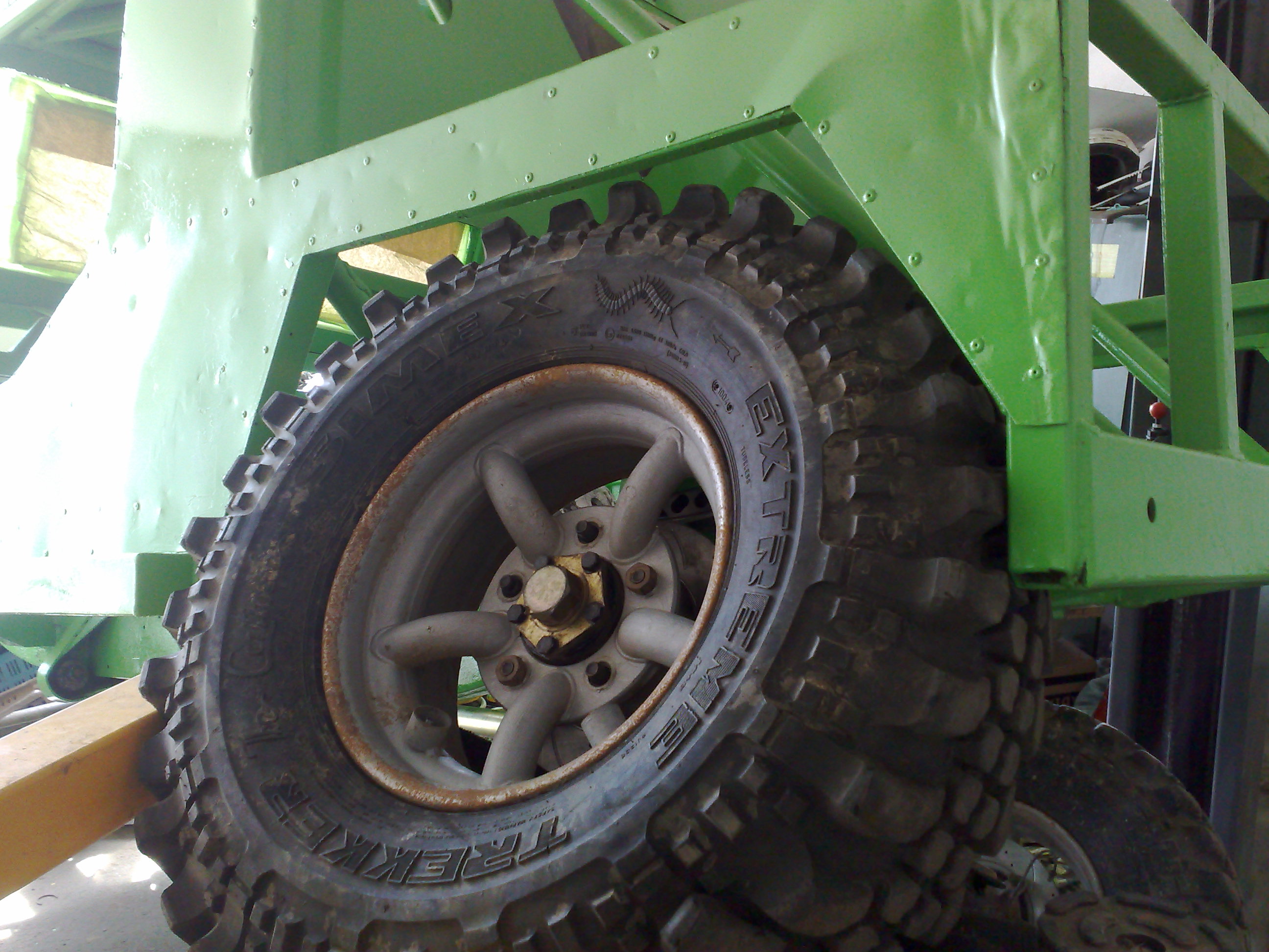 Kolo se zvedne lehce přes 90cm od země, když zbylé tři stojí na zemi. Ale měli jsme přidělané přední pružiny, takže to půjde ještě o trochu víc. Myslím, že metr to dá.