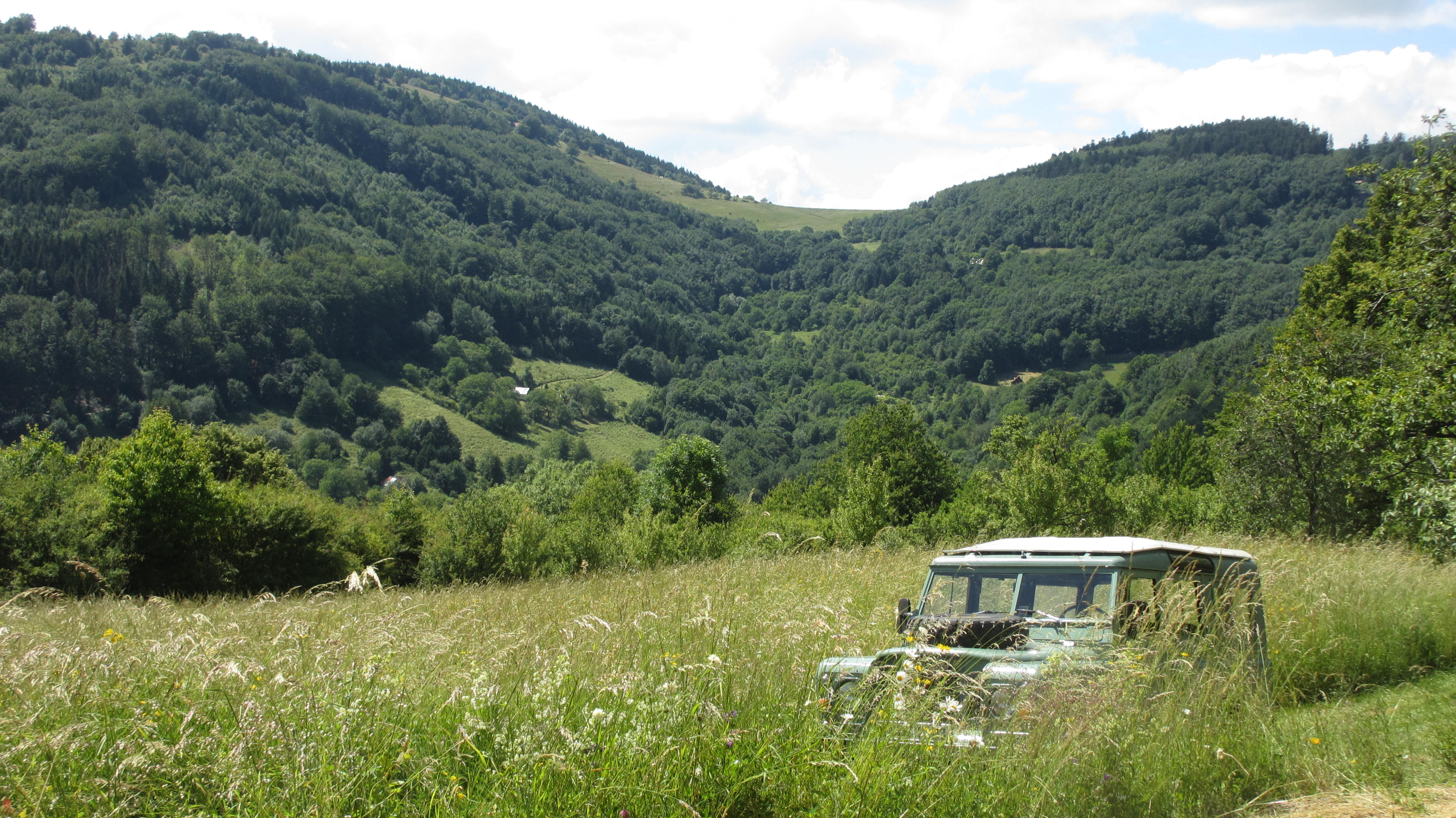 ... a se zvlněnými křivkami krajiny ostře kontrastovaly hranaté tvary našeho Landroveru; nebyly s přírodou v rozporu, jen ji vhodně doplňovaly, tak jako horkovzdušný balón nebo dvouplošník doplňuje nebe poseté kumuly a činí tak pohled ještě melebnějším...