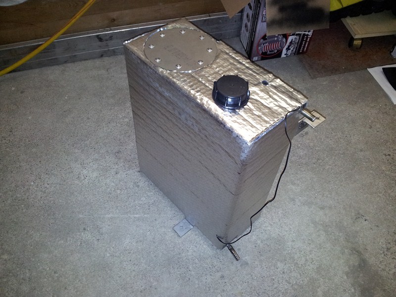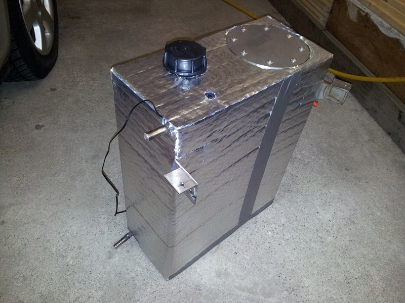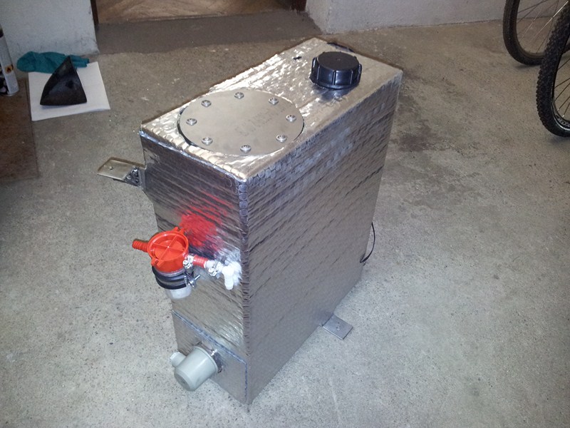 Prototyp nádrže s 300W topnou patronou a termostatem je ode dneška provizorně v autě. Zatím aspoň nějaké foto nádržky...