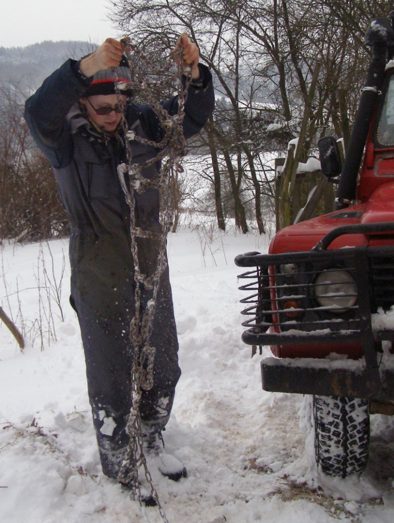 Dále bych pustil 4 x sněhové řetězy na defa (jezdil jsem je na 235/85/16) ale jsou to ty stare Háčka, co jsou jako žebřík a je potřeba na ně najet - teda já to zvládal i po zapadnutí protočením kol, ale je to očistec. A rovnou říkám, že ten H profil prostě při traverzu ostrým svahem nechává klouzat trochu bokem. Kopací síla směrem vpřed v případě osazení všech 4 kol a mezinápravové uzávěry je celkem brutální. Je to výrobek nějaké české řetězárny, ale nemám je teď u sebe (na chalupe), chtěl bych za všechny 4 kusy 1935,- korun. poctivy materiál, pytel tech 4 kusu je pekejne tezkej. Samozrejme prvni brutalni pomoc je uz pri pouziti jednoho paru, ale jsou 4 ks!