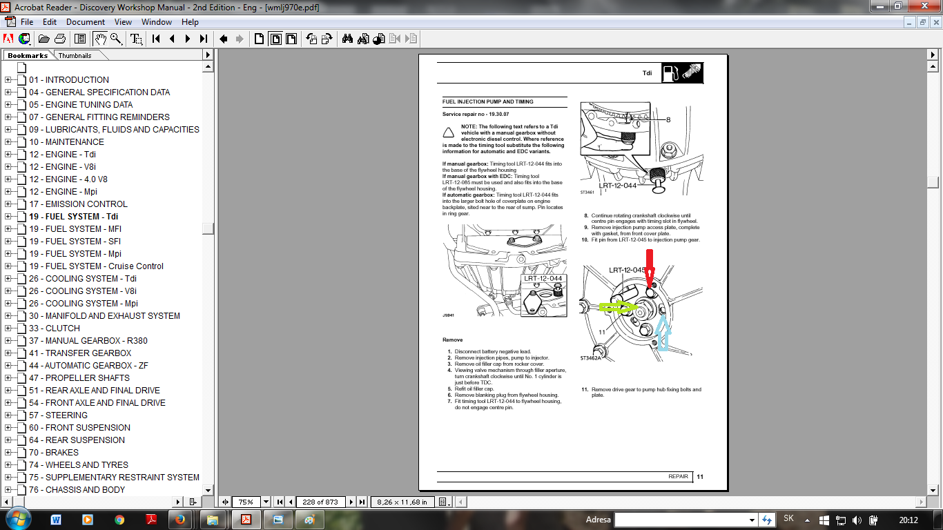 Takze na motore 300Tdi v defe a aj D1 je na kryte rozvodov trojuholnikova krytka, pri verzii s klimou je ta krytka (obrazok 1 cierna sipka) nahradena napinakom remena klimi. Je prichytena troma skrutkami na 10 kluc. Po demontazi sa pod krytkou nachadzia jedna velka matica asi kluc 22 (obrazok2 zelena sipka) a po obvode 3 skrutky na 10 kluc (obrazok 2 cervena sipka). Tie 3 skrutky sa povolia a potom sa da otacat maticou v strede. Posun cerpadla si kontrolujte zrkadielkom podla umiestnenia otvorov (obrazok 2 modra sipka) ktore su na obvode medzi skrutkami. smer pootocenia je lubovolny, treba skusit ja som to posunul vpravo. Pozor staci pohnut 1mm. Takto sa nacasuje cerpadlo aby fungovalo spravne.