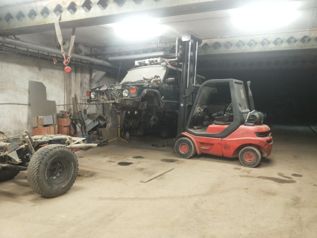 Pánové, ale koukejte na to, jak je to auto zvednuté? Za paletu....která je na střeše!! Tomu říkám kreativita.....RRC v podvěsu :-)