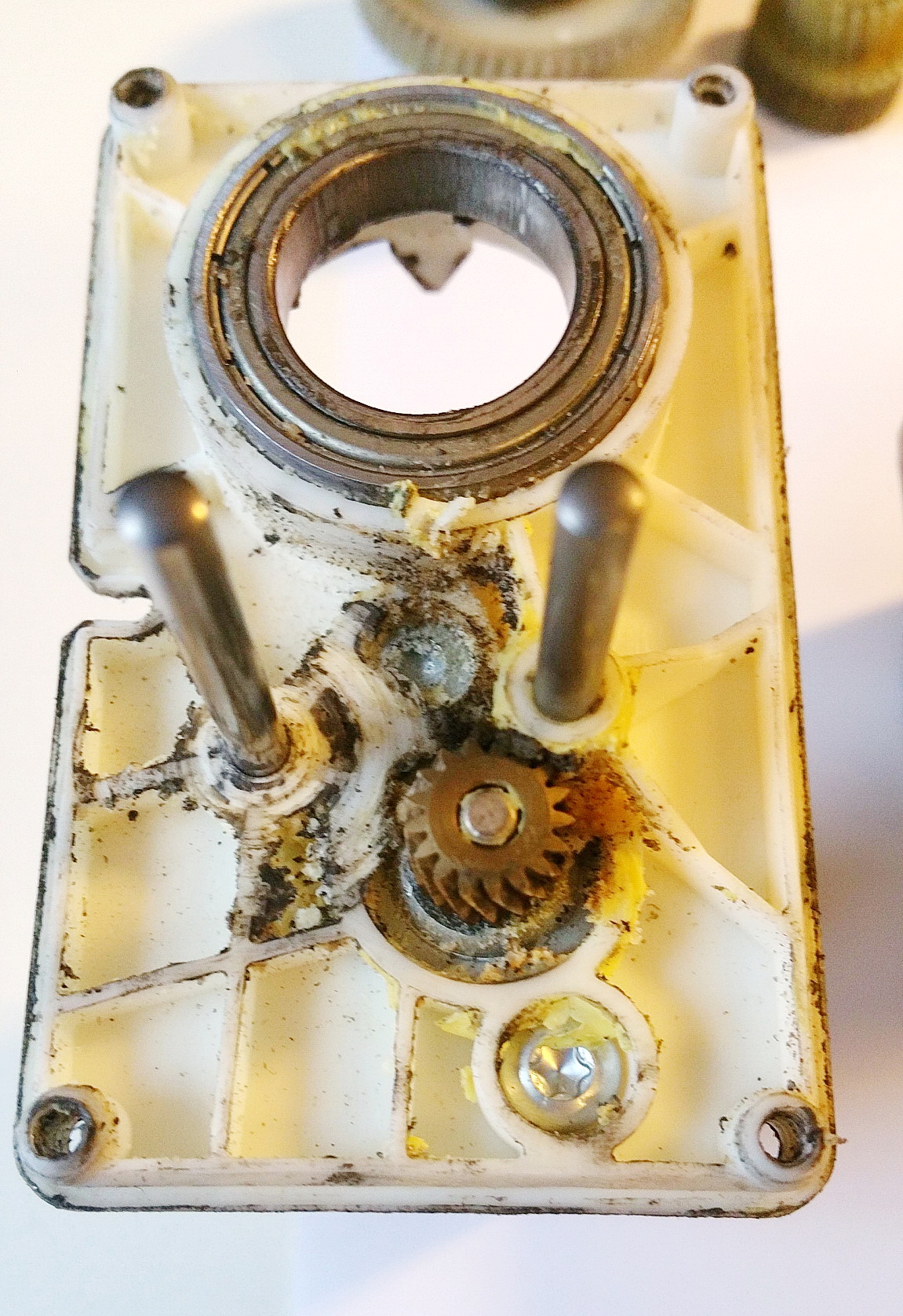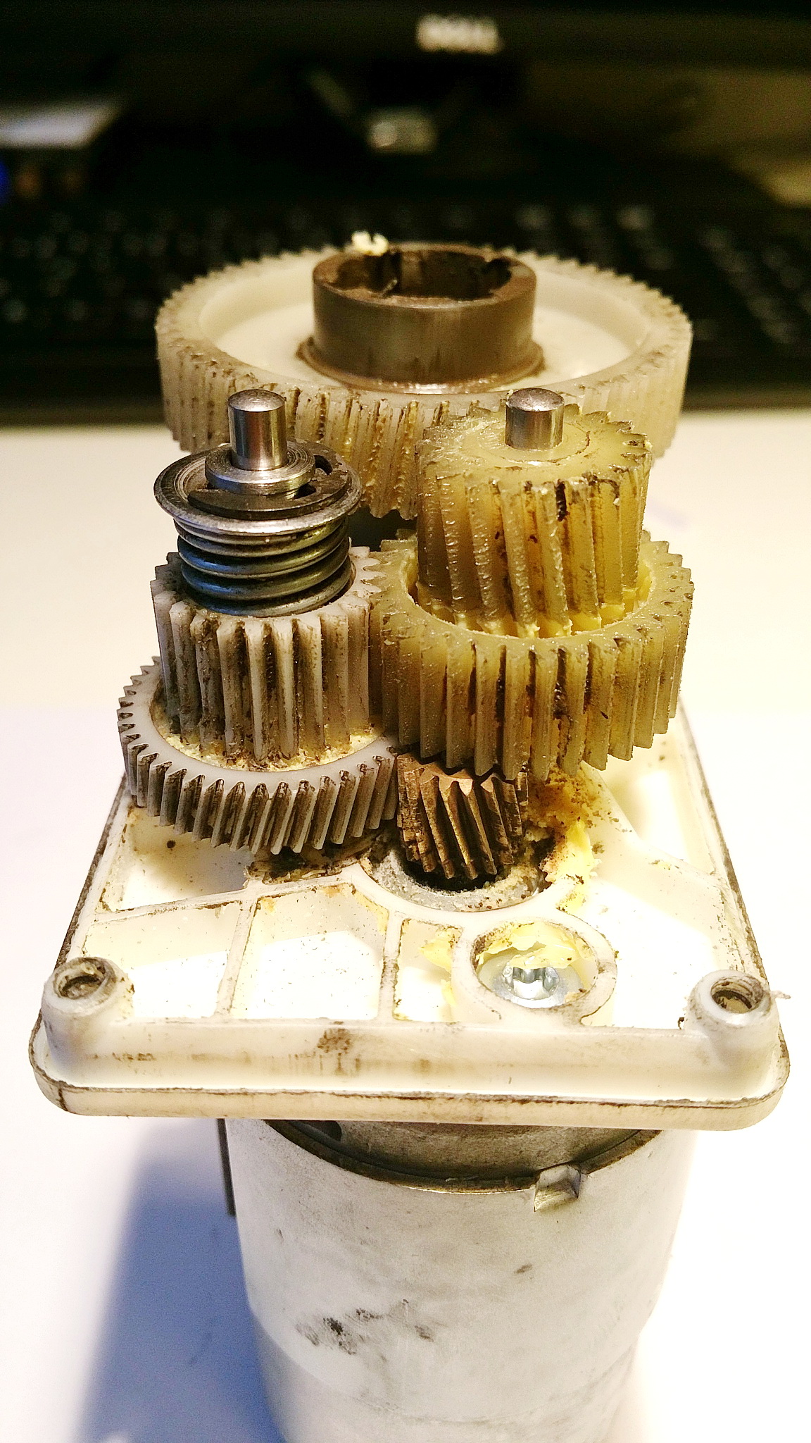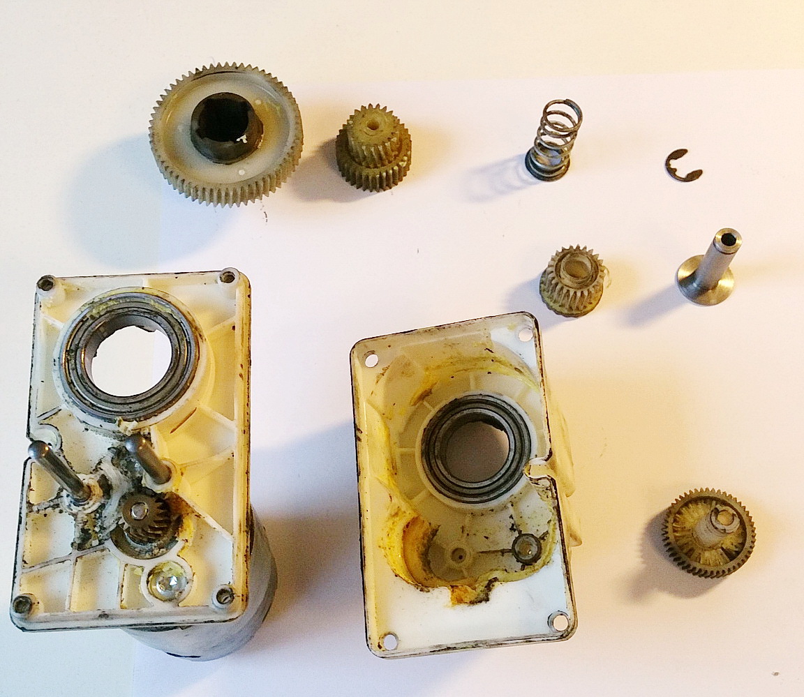 Problem je tedy v tom, ze v převodovce moturku EPB je pritlacna spojka, která při prekroceni limitu sily zacne preskakovat (coz je zdrojem toho priserheno zvuku). Sila je definovana přítlačnou pruzinou. Tu přes závlačku drzi krcek ozubeného kolecka v one převodovce. Drazka v krcku drzici závlačku je poddimenzovana a casem se ulomi. Po ulomeni se pruzina opre o vnitrek housingu převodovky, který je o několik milimetru dal. Tim se pritlacna sila vyrazne snizi a spojka preskakuje mohem dřív. EPB pak rve uz celkem pravidelne.