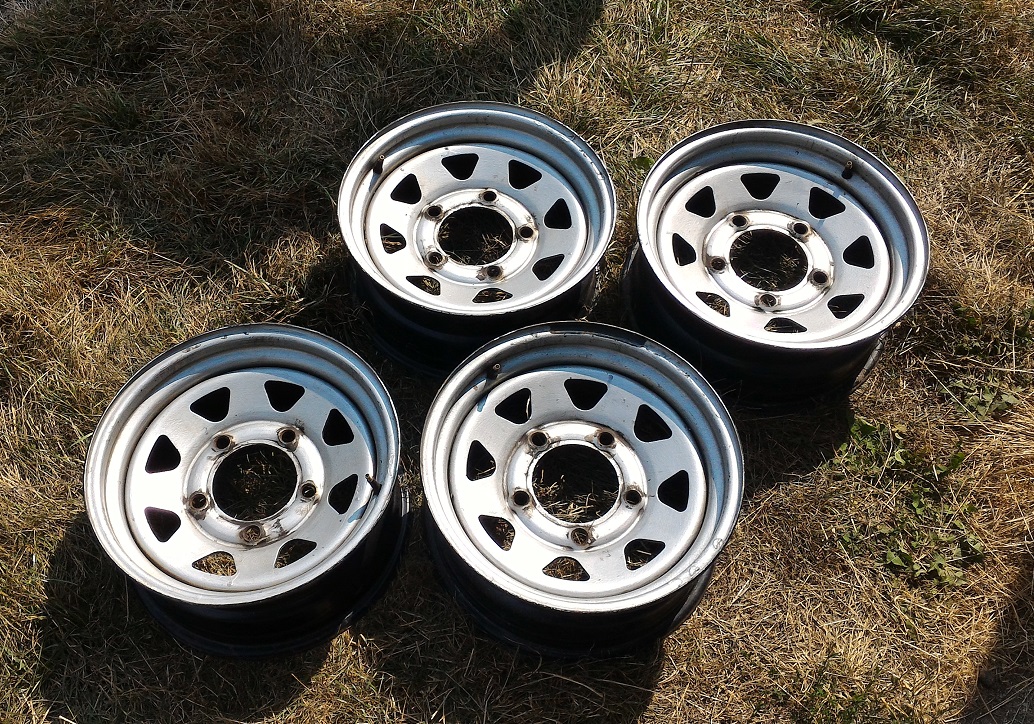 Sada 4 ks disků DOTZ 7x16 ET8. Z čela jsou napajcované nějakou stříbrnou barvou, která už by si zasloužila obnovit.