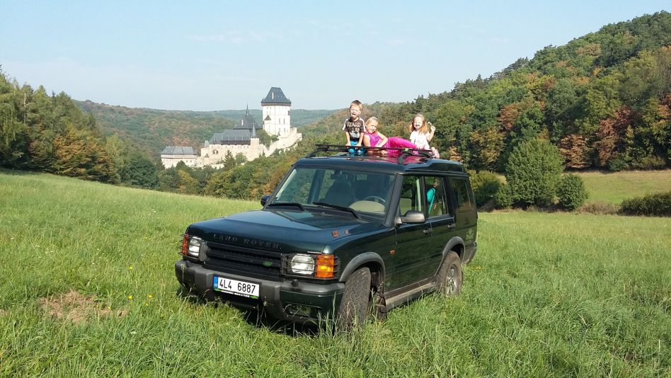 Tady s dětmi na louce kousek od domečku (ten na fotce není). Jako čerstvého vlastníka Land Roveru mne stále nepřestává fascinovat, kolik je najednou kolem cest, které ještě před týdnem nebyly, a kam se všude dát jet na výlet, aby si to děti užily