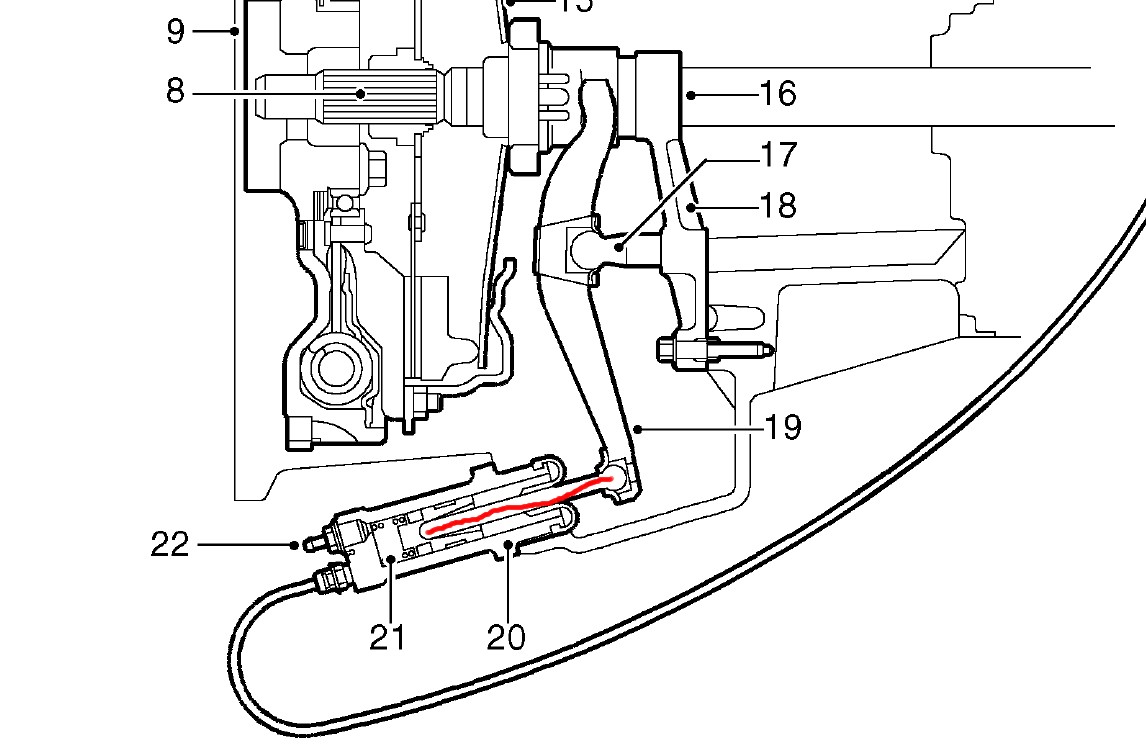 - při demontáži toho stávajícho válce jsme zjistili, že ta vypínací tyčka, co je vyznačena na obr. červeně tam kloktá a lítá docela volně... je možný, že se prodřela tou spojkovou pákou (díl č. 19)?