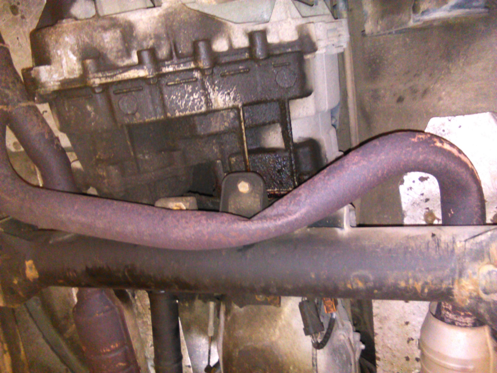Po složení s opravenými hlavami a novou cívkou motor již běžel na 8, ale stále svítila kontrolka motoru. Diagnostika vypisovala cca 10 chyb, všechny neobvyklé. Povolal jsem elektrikáře, zjistil, že napájení snímače polohy vačky je zkratované na kostru. Po odstrojení jsme našli kde - držák čidla byl otočený o 90° a proštípl izolaci kabelu. Ten kdo to montoval byl buď slepý, nebo idiot... Izolaci jsme opravili, zmizela většina chyb, zůstala lambdasonda, váha vzduchu, ale stále to hlásilo chybu signálu od snímače vačky. Vyměnili jsme lambdasondu, která měla dráty prošoupané o kardan přímo v místě, kde vystupují ze sondy, takže neopravitelné (při tom jsme zjistili, že jedna větev výfuku je po nějaké příhodě na spodku auta zdeformovaná tak, že je téměř neprůchozí - foto), váhu vzduchu (byla tam nějaká Britpart nebo Starline, prostě krám co nemůže fungovat ani nový) a stále zůstávala chyba signálu od snímače vačky. Začal jsem tušit problém, a také se to potvrdilo. Auto má vstřikování Bosch, ale nějaký odborník při skládání motoru použil na vačku rozvodové kolo ze staršího motoru, se vstřikováním GEMS.