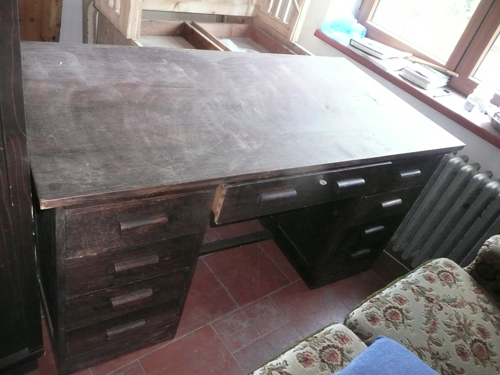 Starý velký psací stůl, 9 šuplíků, velmi prostorný. Cena 2600 kč.