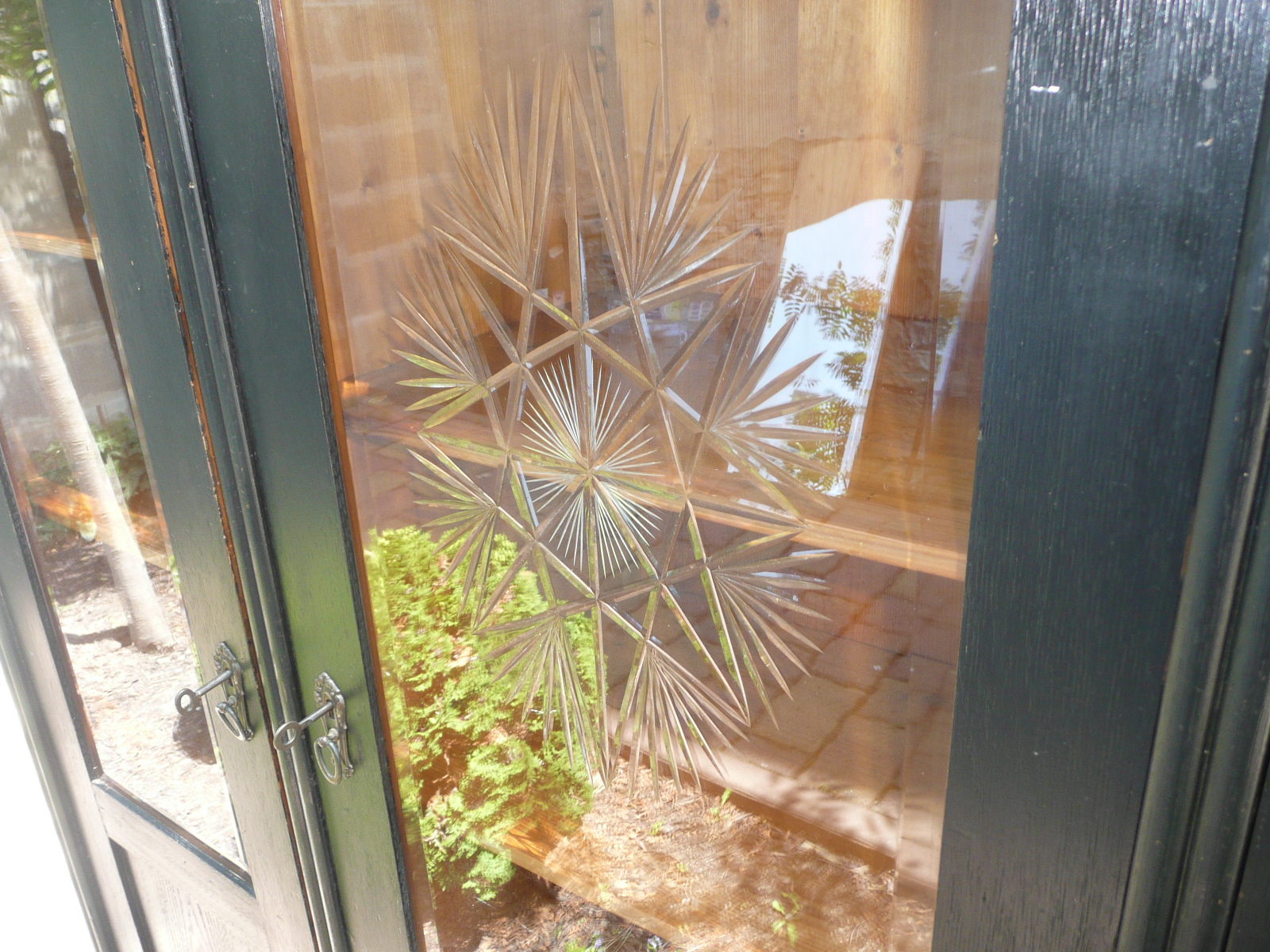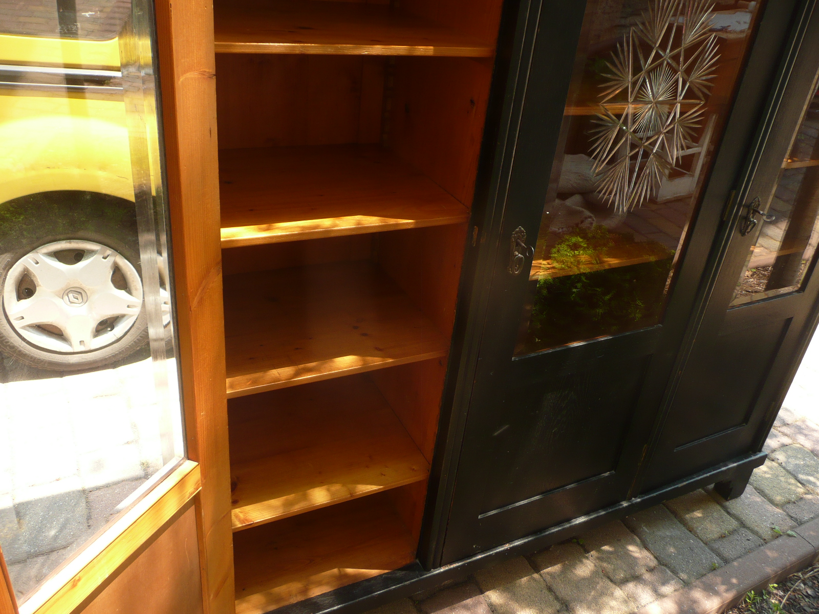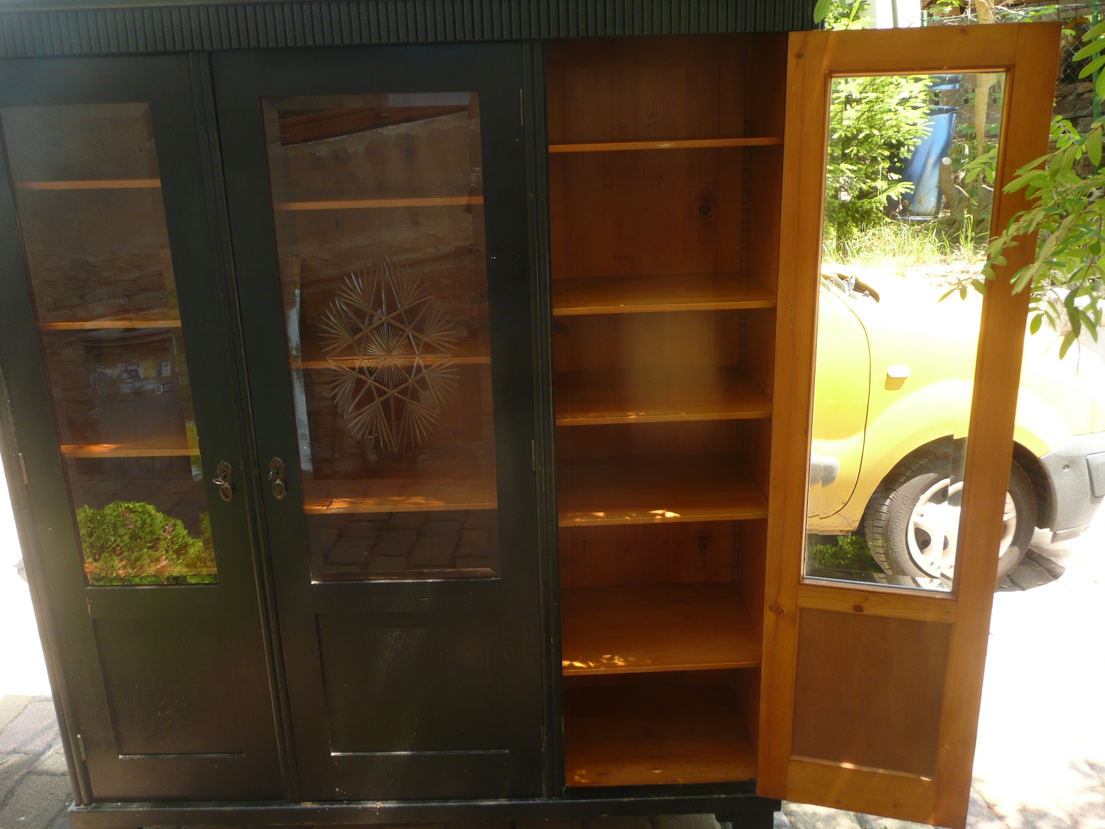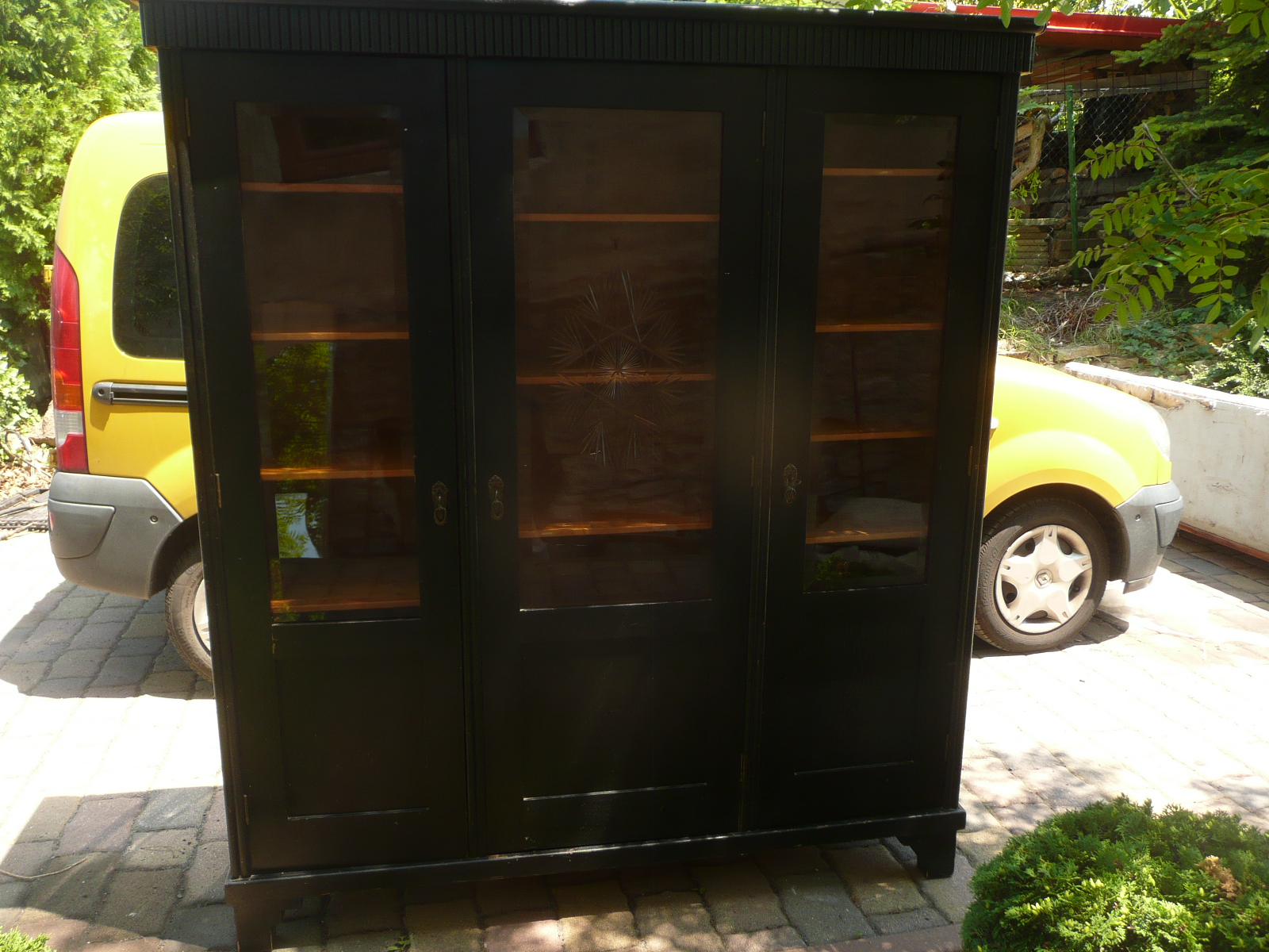 Stará skříň - knihovna, bez červotoče, bytový stav. Krásná broušená skla, délka 170 cm, šířka 48 cm a výška 185 cm.