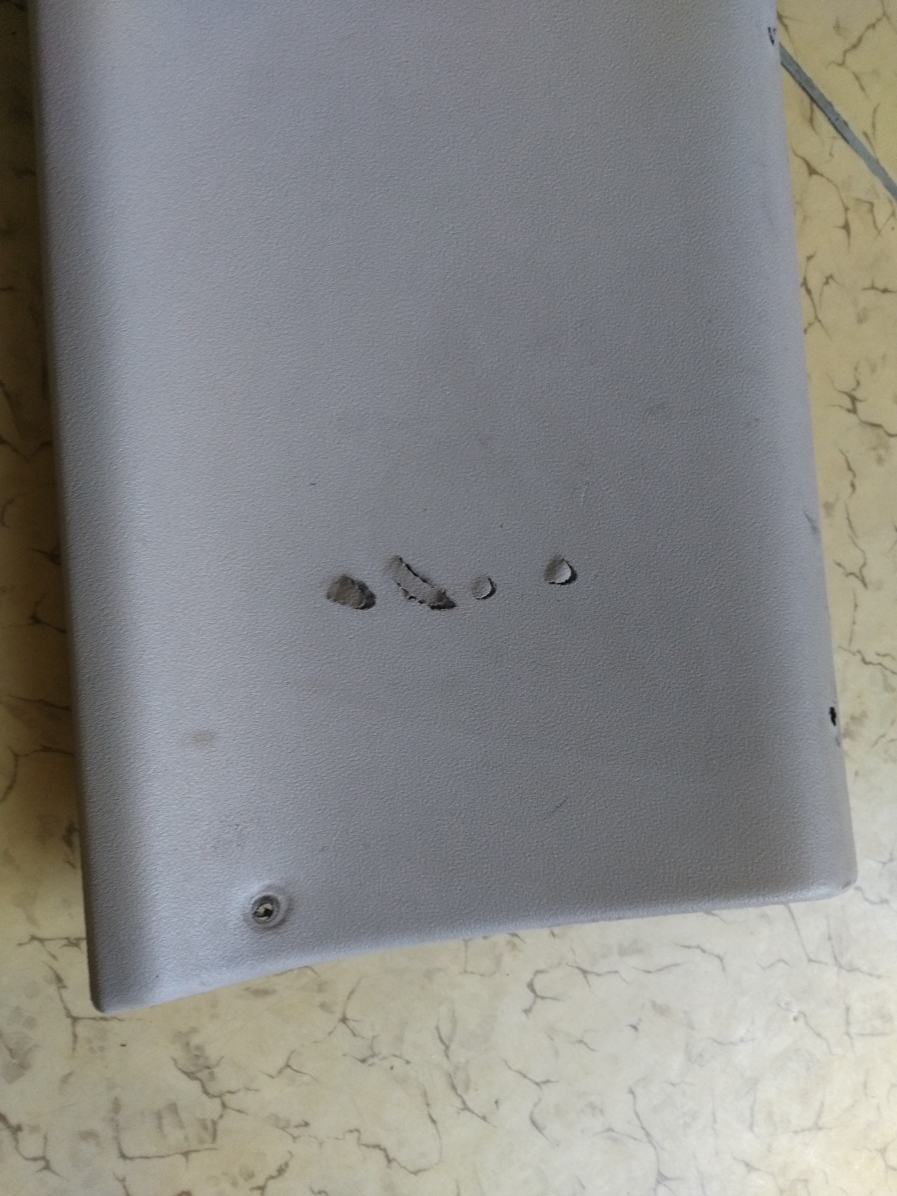 Foto plastů. Ten pravý je drbnutý nad spodním zadním krajem. Podle mě by to s jistou dávkou šikovnosti šlo zpět nalepit, žádný materiál nechybí.