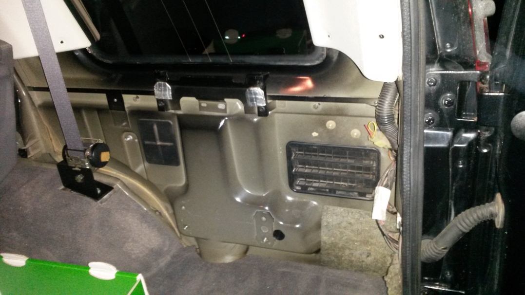 Lišta na stropě. Další kuriozní předmět jsou hlavové opěrky ke kterým náleží i lišta, do kterých jsou chycené. V minulé přestavbě jsem je vyndal i s lištou a nahradil lištou pro pětimístnou verzi, ve druhé své přestavbě zvažuji, že je tam nechám (jako vázací bod pro materiál, nebo prostě jako zarážku proti něčemu, co se z kufru už definitivně valí ven – třeba hromada tašek a spacáků apod.) Až neuvěřitelné mi přišlo, že hlavové opěrky samotné jsou šroubované skrz kastli tak, že po jejich odmontování vznikne regulérní díra nad těsněním pátých dveří – prostě land rover.