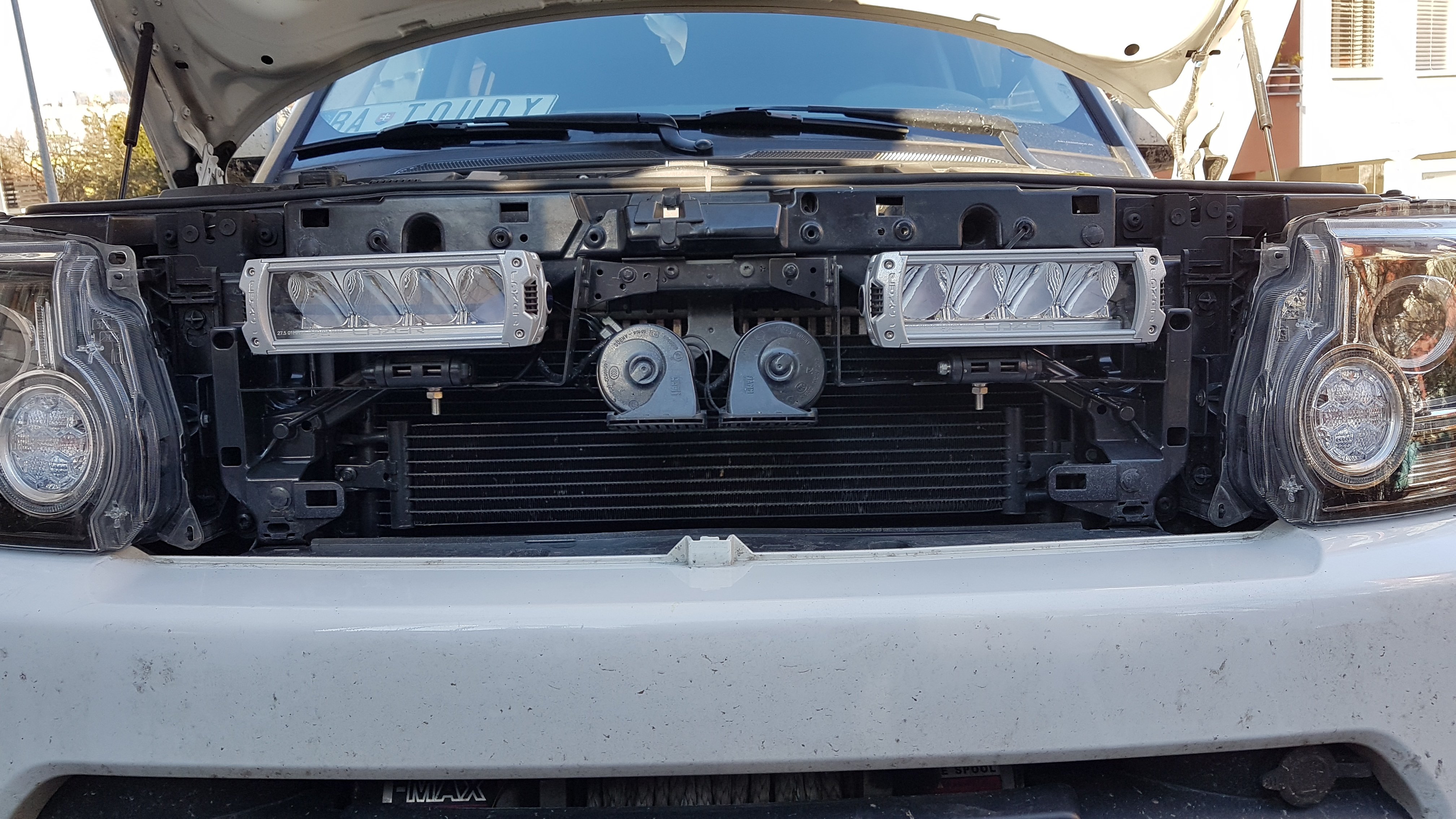 Naištaloval som Triple-R 750 s pozičným osvetlením. Relátkam som dal zbohom, treba ísť s dobou... Namiesto relé (pre spínanie diaľkových) som použil HEXFET tranzistor (IRF4905) s pomocným NPN tranzistorom (MPSA06) a dvoma odpormi (1K a 10K) a diódovým sčítacim členom OR (BYT16P-400 alebo 2x1N400x) pre združenú funkciu obrysové/DRL. Oproti originál držiakom(https://www.lazerlamps.com/home/vehicle ... land-rover), ktoré sú uchytené o plastovú masku, moja konštrukcia je uchytená o prednú priečku...tam kde sú klaksóny... voilà! https://www.lazerlamps.com/home/lights/ ... tion-light