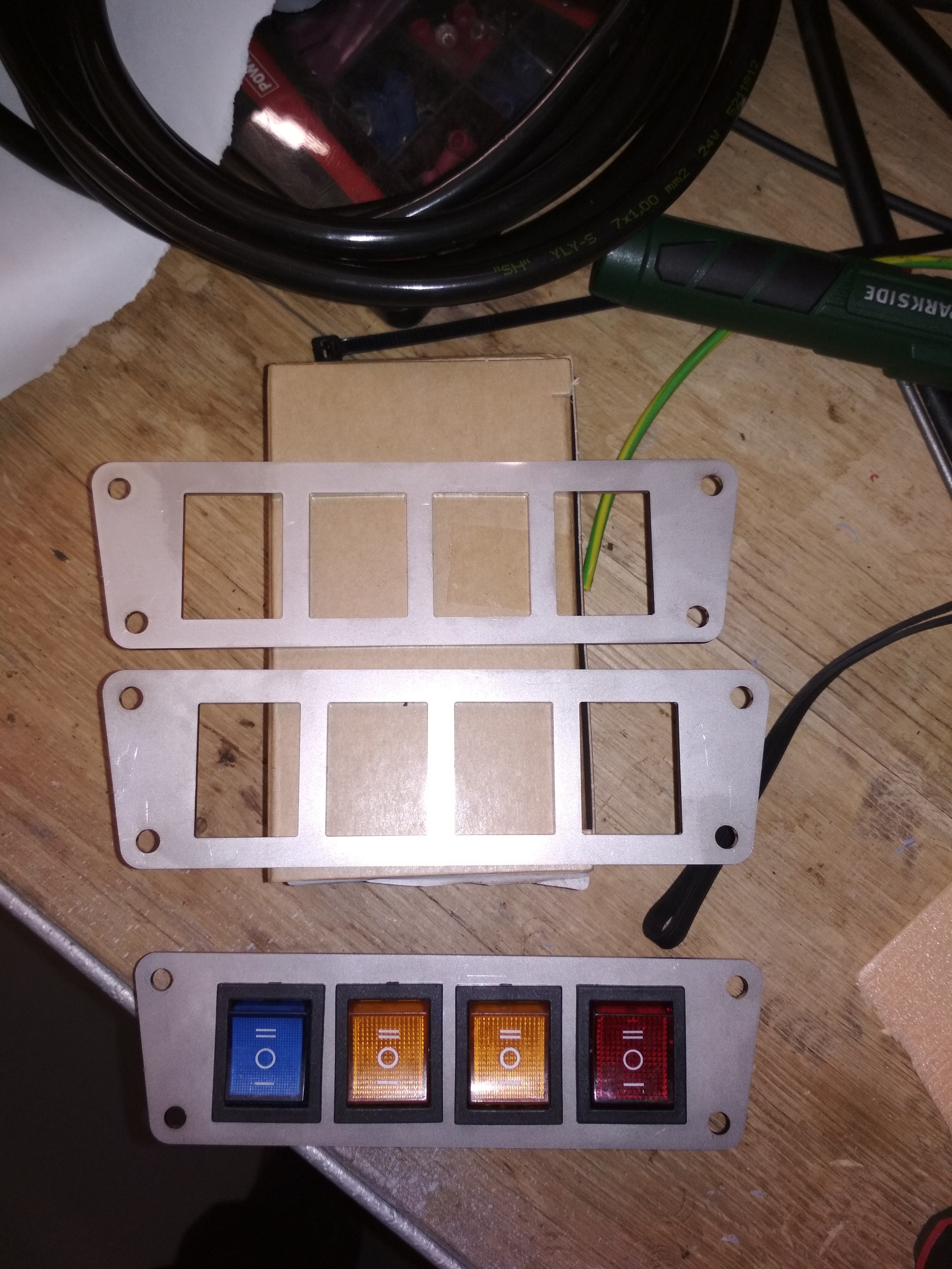 Predám tlačítkový panel pre 4 trojpolohové podsvietené vypínače - bežne dostupné. Pasujú samozrejme aj dvojpolohové. Panel je z 2mm nerezu. Mám dva kusy.