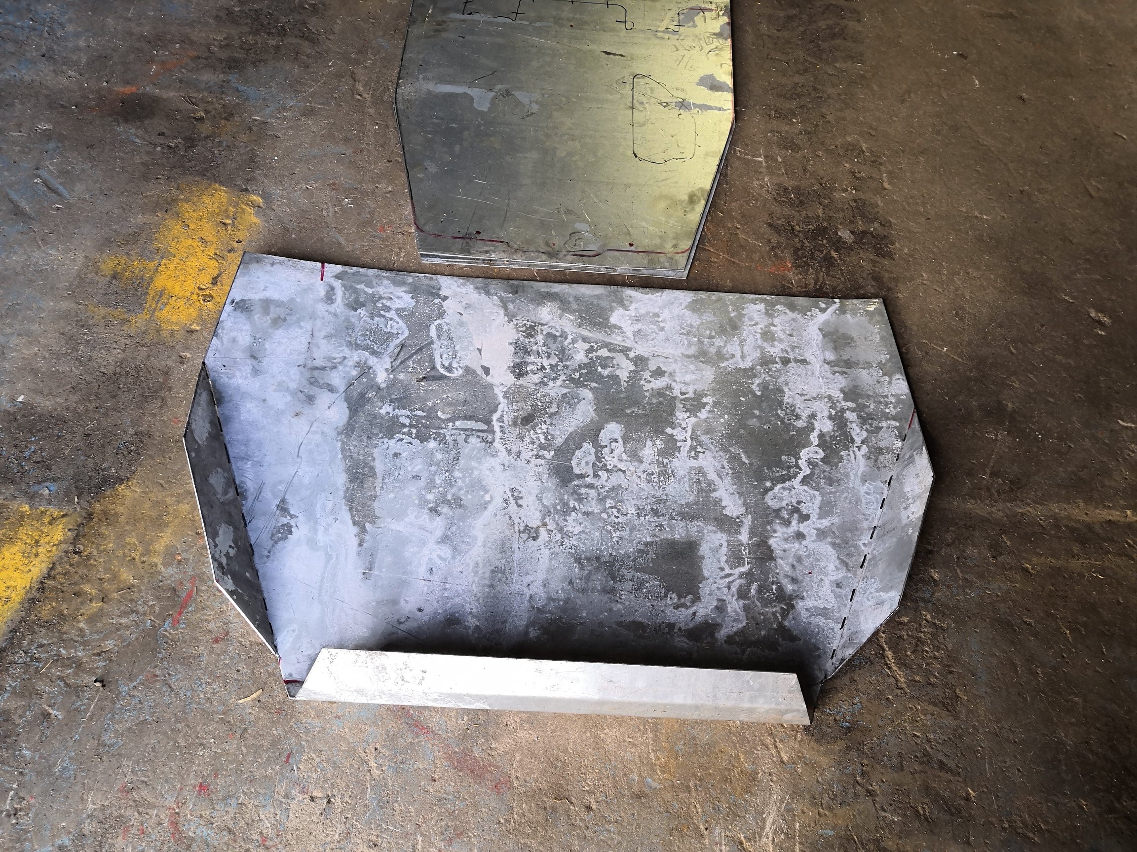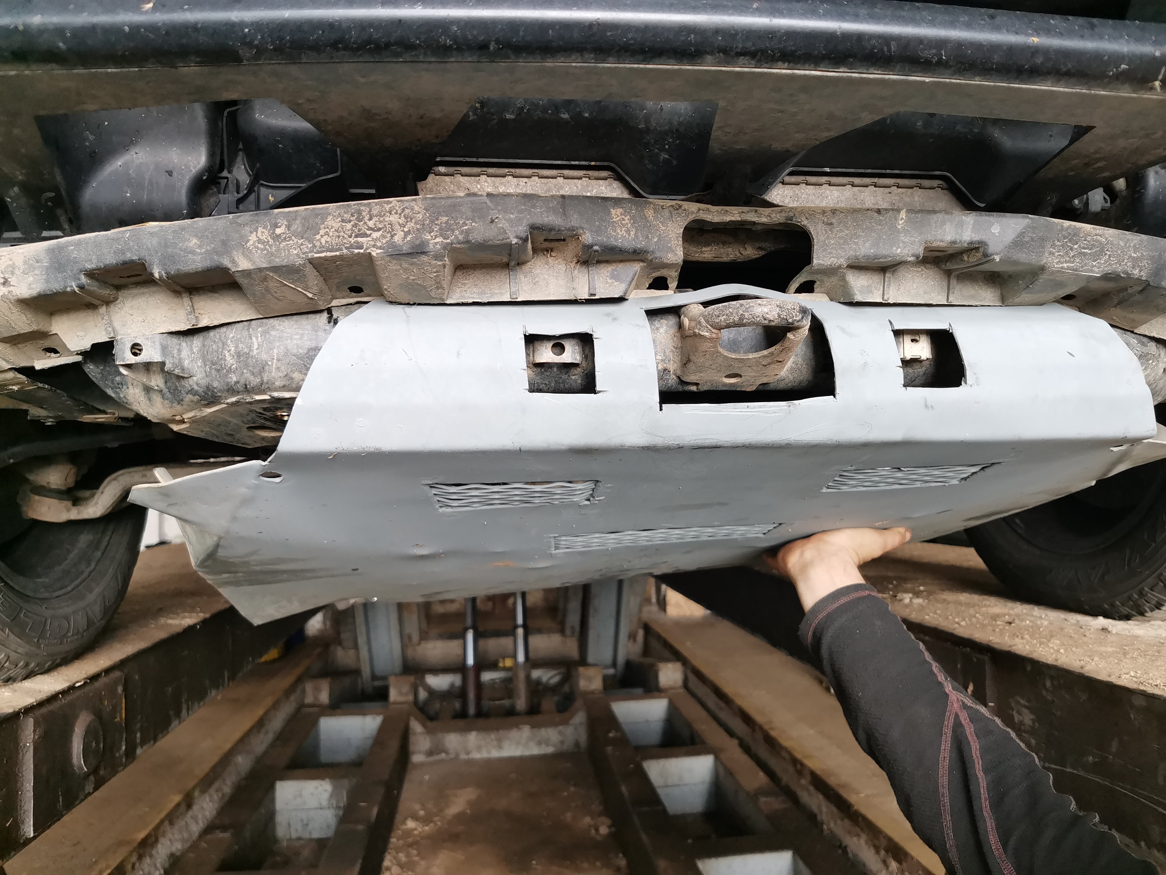 Nakonec jsem použil jeden plech silnější, 4mm, karosářský pozinkovaný. Už jsem se po něm vezl několikrát po kamenech a zatim v pohodě. Dříve jsem to měl našroubovaný šrouby s matkami. Teď se chystám tam na nýtovat matky.