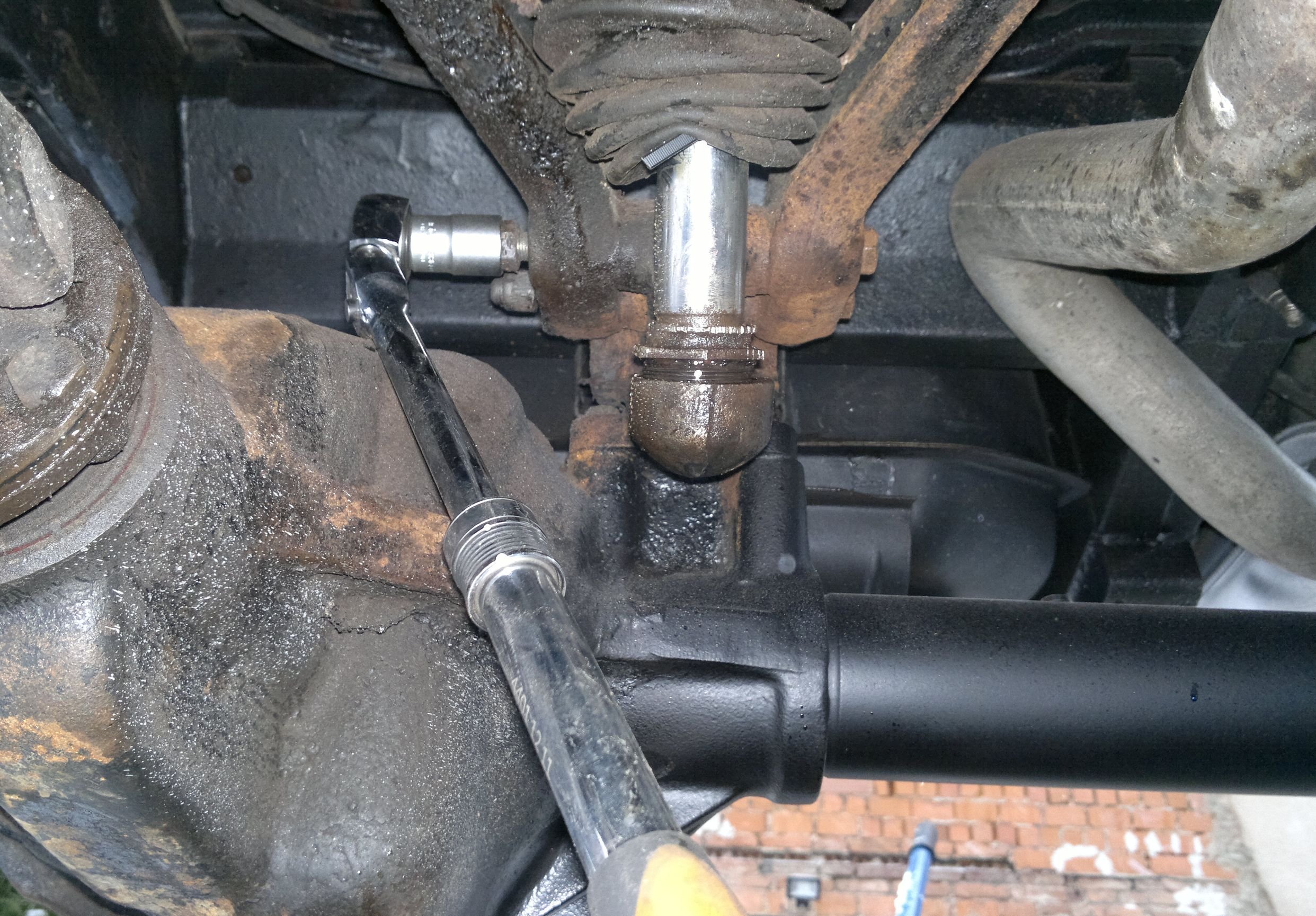 Cha chá, to jsou vyhlídky. Myslím, že začnu brousit vrtáky, protože mám tušení že to teplo a palice už nezaberou. Ale aspoň bych to mohl celé sundat z auta. Přes násobič momentu se mi podařilo povolil šrouby co drží ramena. A už jsem i vyzkoušel okouknutý trik, že pro snadnější vyndání čepu z držáku na nápravě je dobré heverem přizdvihnout předek hrušky diferáku, aby se náprava zvrátila a čep hladce vyklouznul, což se osvědčilo. To bych to Áčko moh sundat celé.
