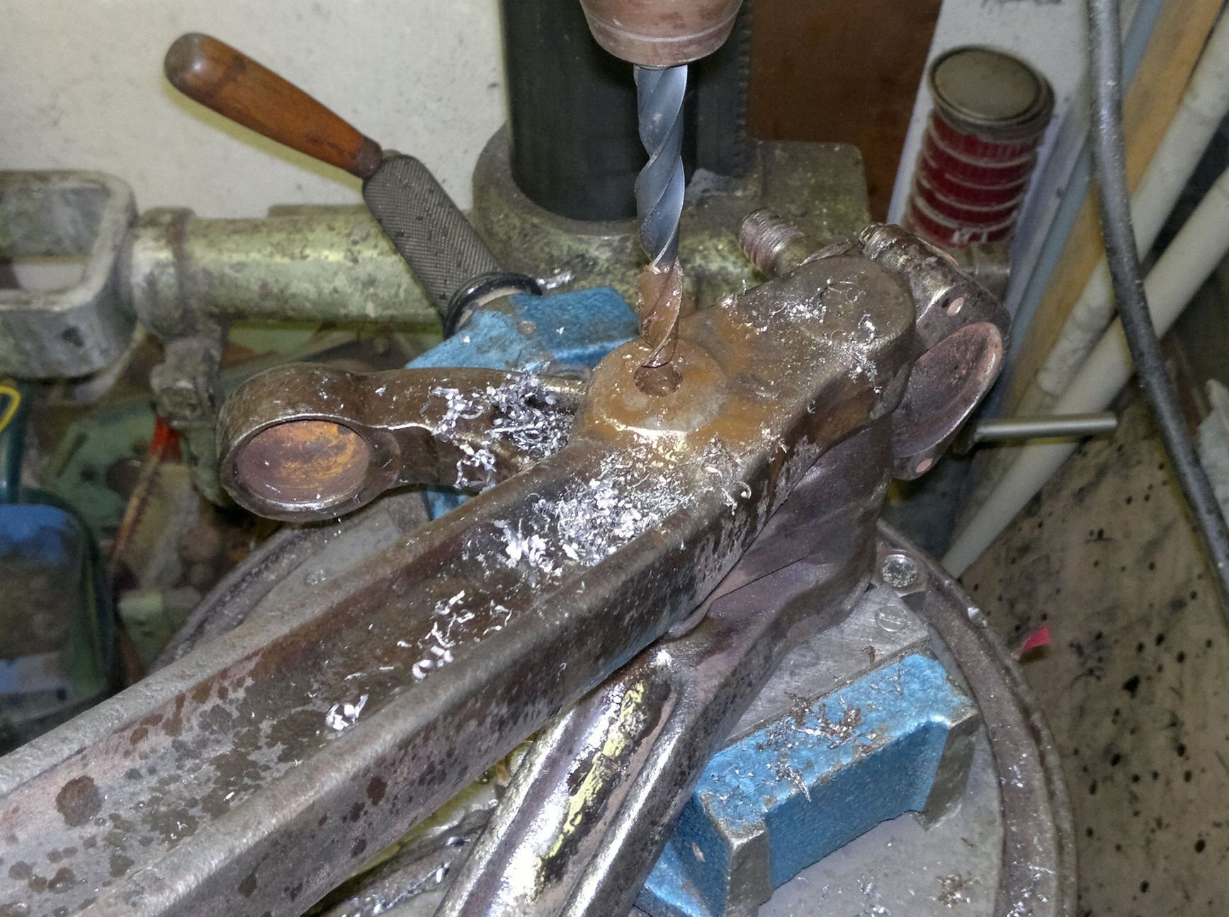 Ramena jsem musel začít odvrtávat. Pořídil jsme si i 20t lis, ale ani při deseti tunách se šrouby nepohly o píď. Ale byl to jen test, protože to nemám zatím vybavené na pořádné upnutí a ani sem to netrápil ohřevem. Vyklepnutí ramene na starně u matek pomocí klínu jsem zkoušel taky a nic.