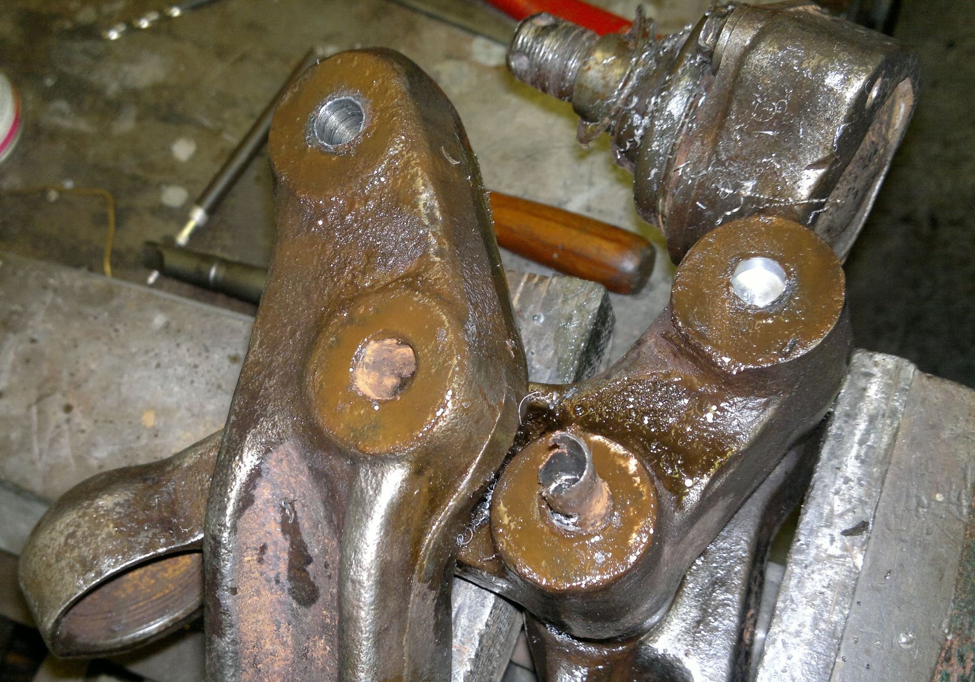 Copak mi to připomíná.... To rameno, kde nejsou hlavy šroubů se mi podařilo vypáčit, když jsem to mezery mezi ramenem a držákem kulového čepu postupně natloukal majzlíky ve funkci klínů. Druhá strana ale ani náhodou, až pod lisem.