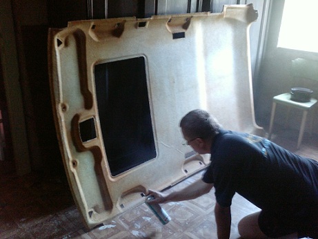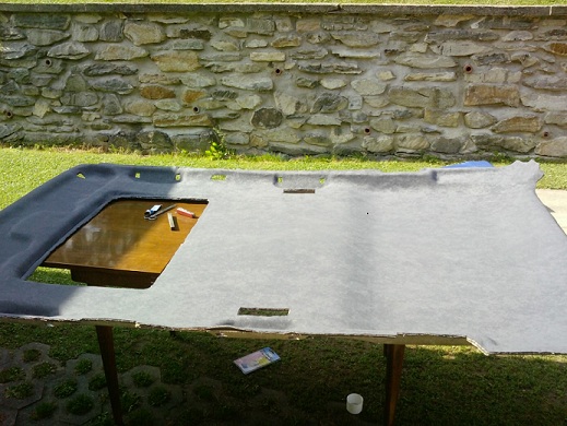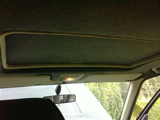 Tak jsem se v létě pustil do výměny stropnice už byla svěšená a špinavá. Látku jsem sehnal kousek od Olomouce, myslím, že to bylo ve vesničce Chomoutov. Koupil jsem trošku tmavší odstín, aby to mělo nějaký kontrast. Lepidlo se jmenovalo Patex. A musím říct, že drží perfektně. Práce to byla spíše odpočinková, ale zabrala skoro celý den
