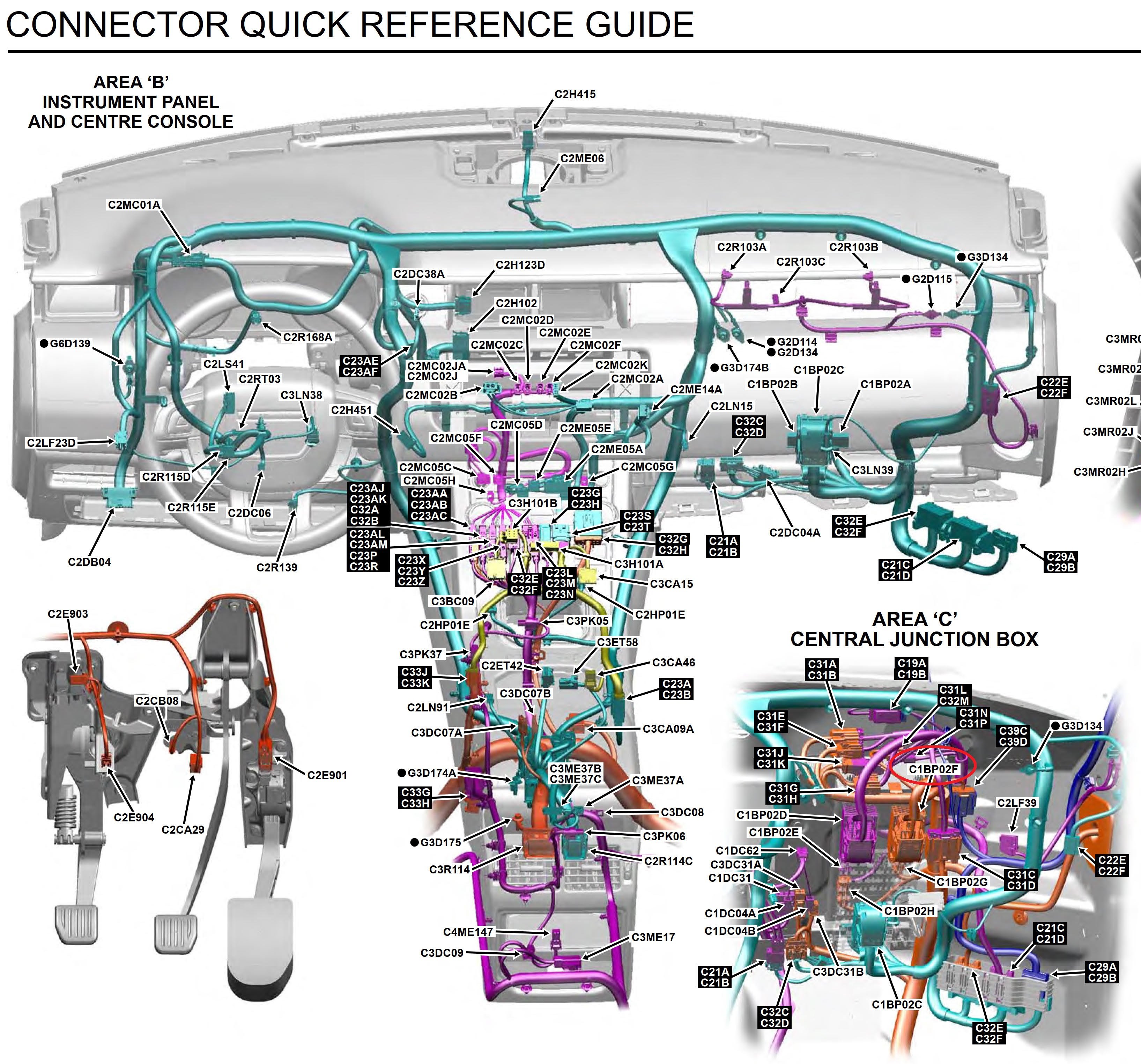 Podle schématu vedou vodiče od světlometu přímo do centrální rozvodnice ( Junction box-Central ), která je vpředu pod kaslíkem u spolujezdce. Tam jsou vyvedený do připojovacího konektoru (C1BP02F). Nejjednodušší by mohlo být odpojit ten konektor a změřit Ohm-metrem spojitost toho vodiče ke konektoru světlometu. Slovo - nejjednosušší - je asi třeba brát s rezervou, protože podle obrázků je Evoque malá elektrárna a asi nebude sranda se k tomu konektoru u rozvodnice dostat. Samotná "žárovka" je spínaná elektronickým modulem.