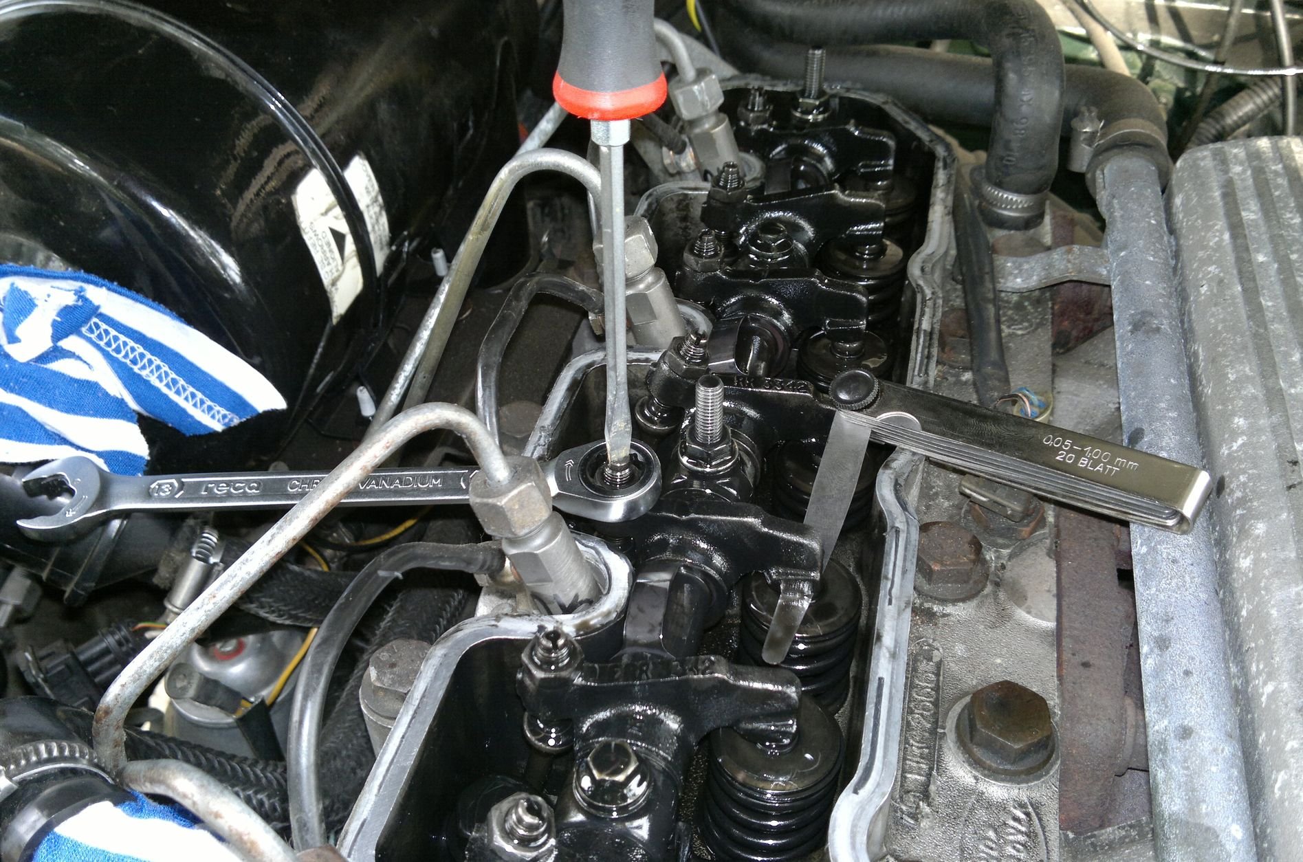 Na kontrolu vůle je ideální sada spárových měrek. Vůle u 300TDi má být 0,20mm. Já jsem vůli měřil tak, že jsem měrku 0,20 kompletně protáhl zprava do leva pod vahadlem. Z kraje se totiž vejde i větší, takže když 0,25 neprošla komplet skrz, tak jsem to považoval za správné.
