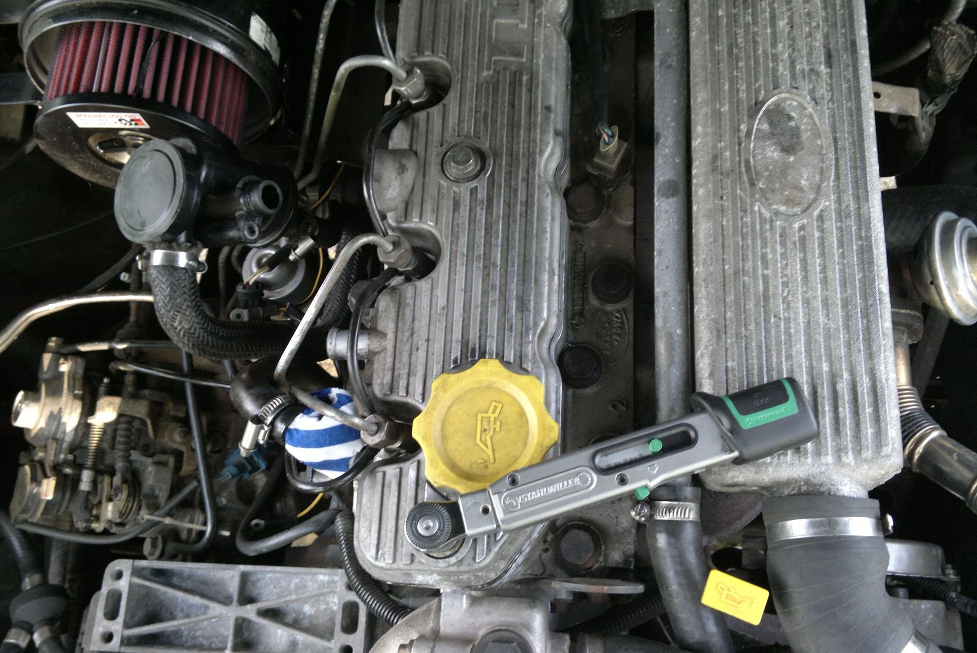 Potíže se objevily při utažení zajišťovací matice adjustačního šroubu vahadla na správný moment - má být 16Nm. Sice jsem použil malý momenťáček (rozsahem 4-20Nm kompletně pokrývá momenty vyžadované při této operaci), ale stejně tam bylo málo místa. Použil jsem nástrčkový klíč, abych mohl přidržovat šroub, ale z levé strany nebyl prostor na pohyb momenťákem, vadily palivové trubky a filtrbox. A z právé strany je zase matka moc utopená a vadí tam oblouk vahadla. Navíc matka je docela měkká a otevřený klíč, který mám na trubkové spoje jí "rozmazával". Nakonec jsem to holt utáhl vořechem bez přídrže a zkontroloval měrkou. Napříště bude asi dobré vyrobit speciální klíč z dlouhého vořechu s navařenou nástrčkou 9x12, aby šel skrz něj prostrčit šroubovák.