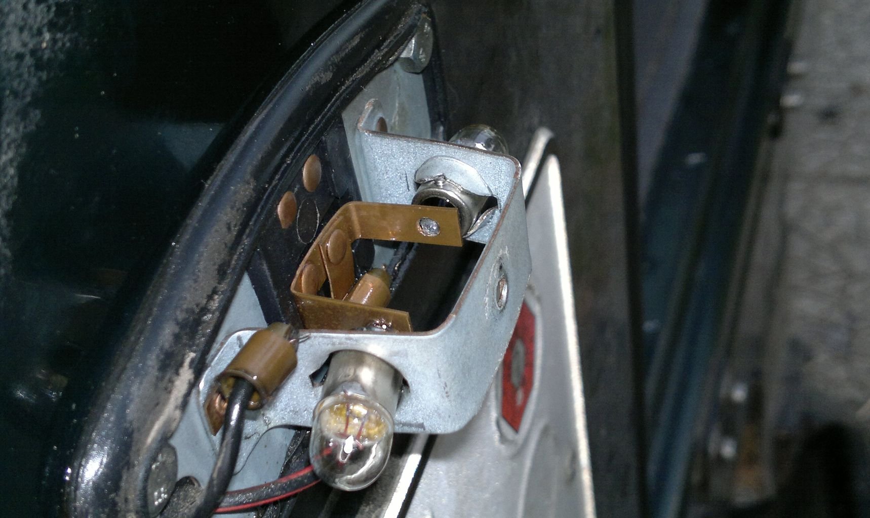Drobná oddychovka - mojí pozornost tentokrát upoutala neosvícená SPZka. Po sundání krytu jsem se ovšem nestačil divit. Ani né tak tomu, že obě žárovičky (typ T4W) byly spálené, ale že měděný kontkakt, který je napájí byl vyhnutý a uskočený a taktak, že se nedotýkal kostry jedné z žárovek. Stačil milimetr a bylo by o zábavu postaráno. To bych asi ňákou chvíli běhal kolem auta, kdyby mi hořela pojistka od obrysovek na levé straně :grin: