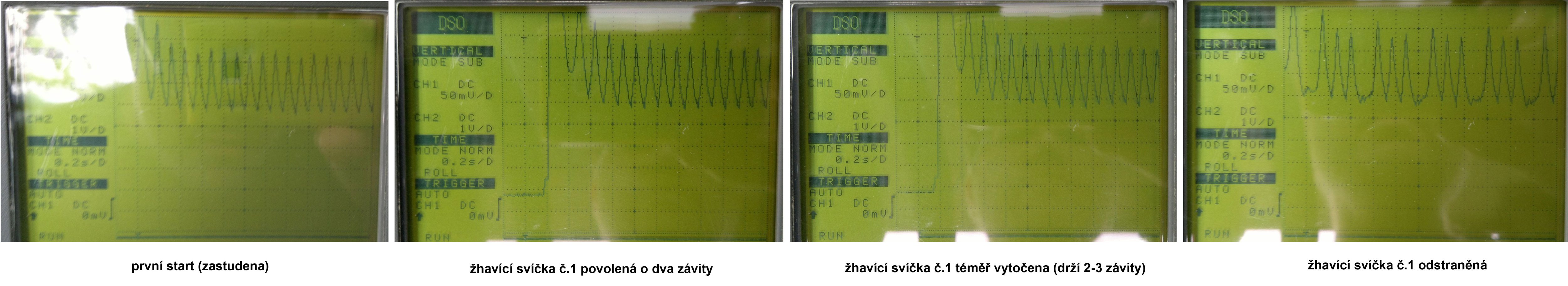Překvapilo mě, že povolení žhavící svíčky nemělo na kardiogram žádný zásadní vliv. Napřed jsem jí povolil jen o dva závity a v druhé fázi jesm jí teméř vytočil, že držela jen na posleních 2-3 závitech, normálně se vaklala. Zřejmě hraje roli i žhavící elektroda svíčky, která asi těsně pasuje do vodícího otvoru pod jejím sedlem. Teprve úplné vyndání svíčky mělo razantní vliv.