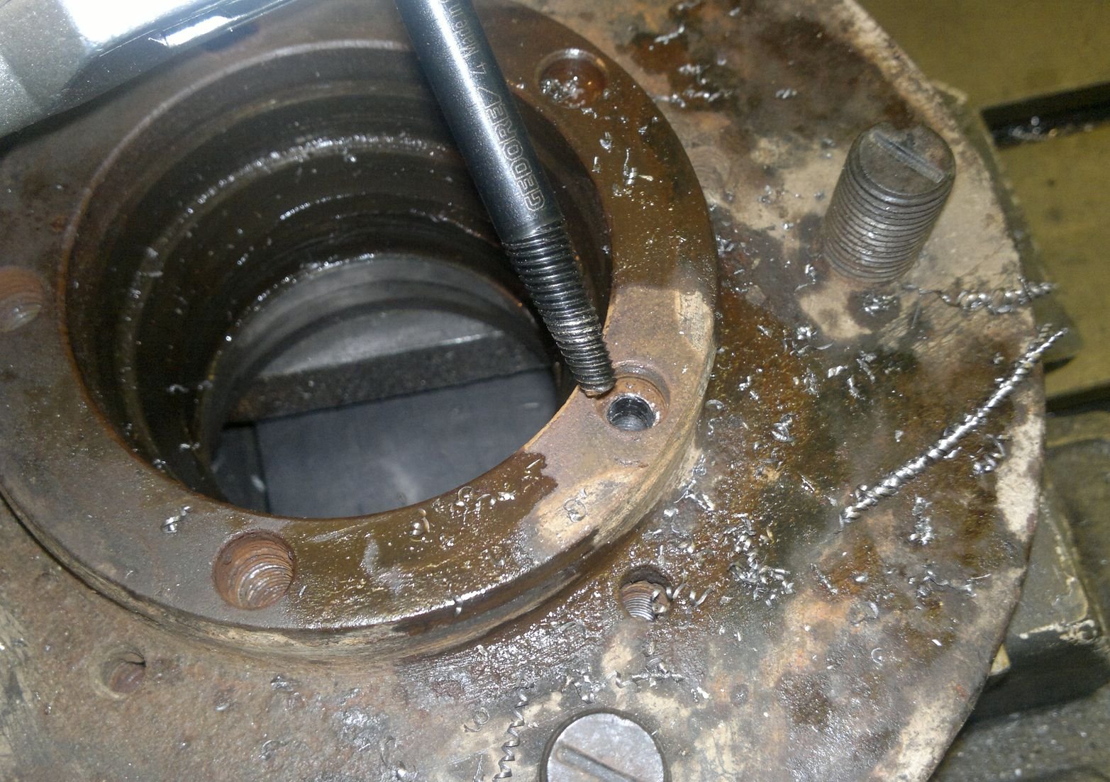 Větší vrták se krásně navedl do vodící díry po předchozím pokusu a k žádnému štrejchnutí závitu nedošlo. Zbytek masa v závitu už stačilo vyčistit závitníkem.