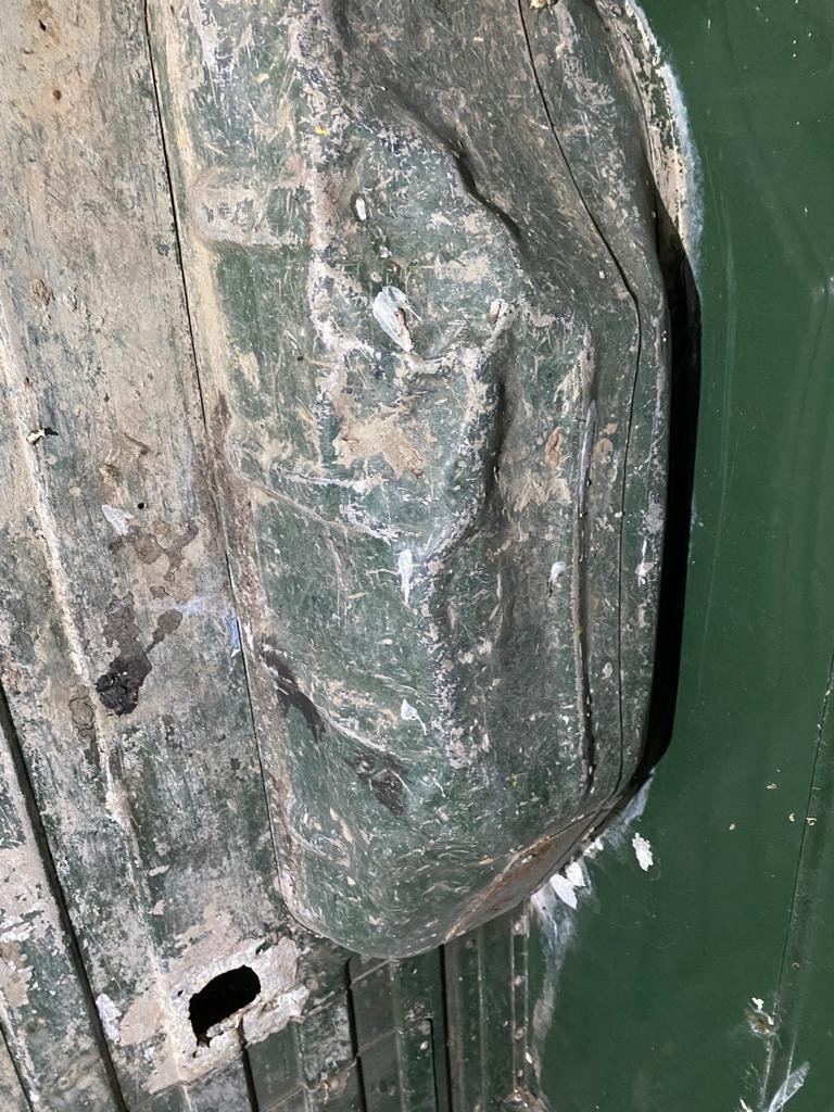 Fotky zde. Pravý bok bez poškození, levý má odřené místo u zadního rohu. V podlaze 4 díry po vázacím oku.