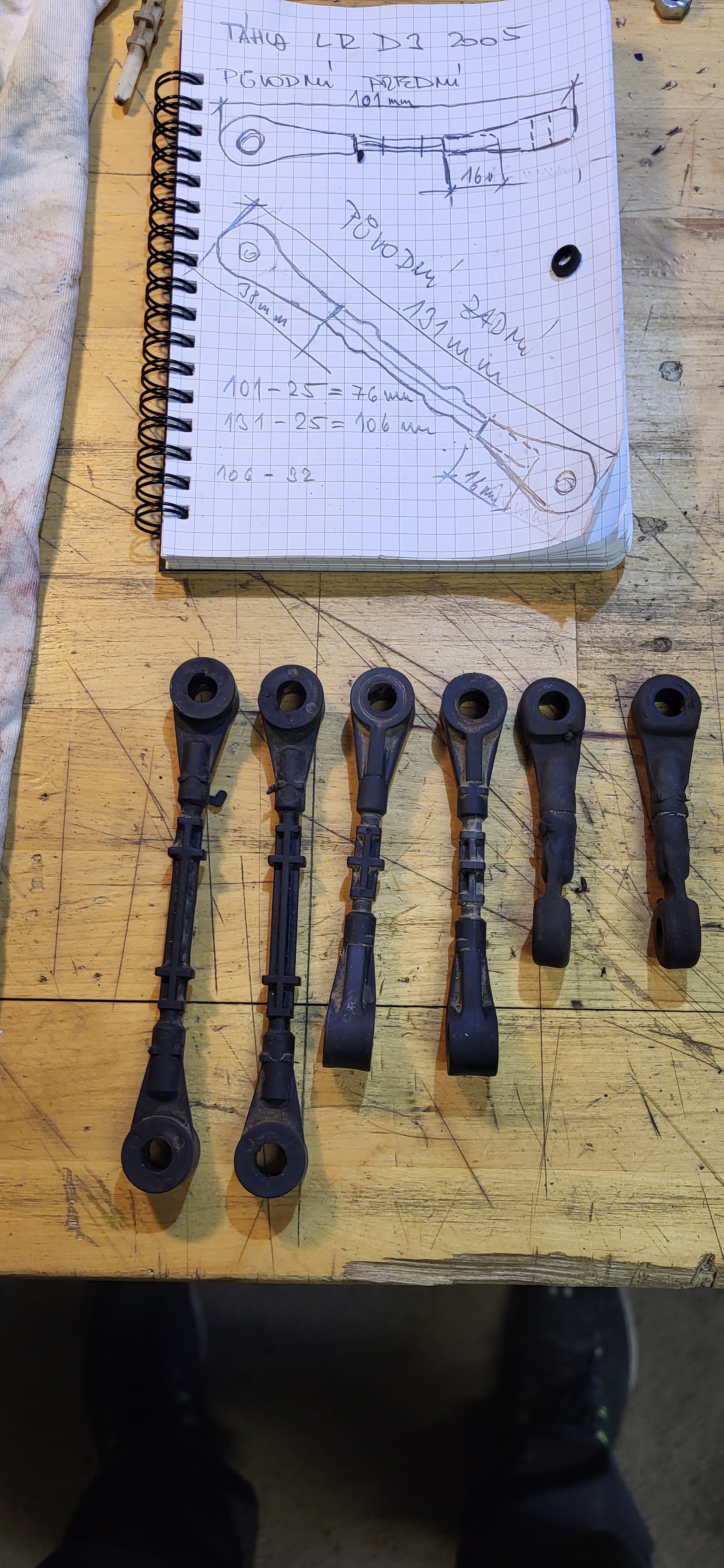 A pak jsem ještě, zkrátil o 2.5 cm táhla čidel výšky, vepředu jsou kratší a vzadu delší. Po úpravě předek 75mm a zadek 105mm.