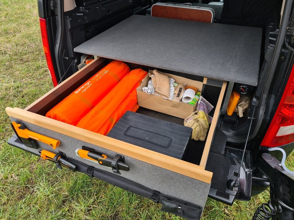 - po domácku vyrobená spací vestavba s jedním šuplíkem a možností prodloužit směrem