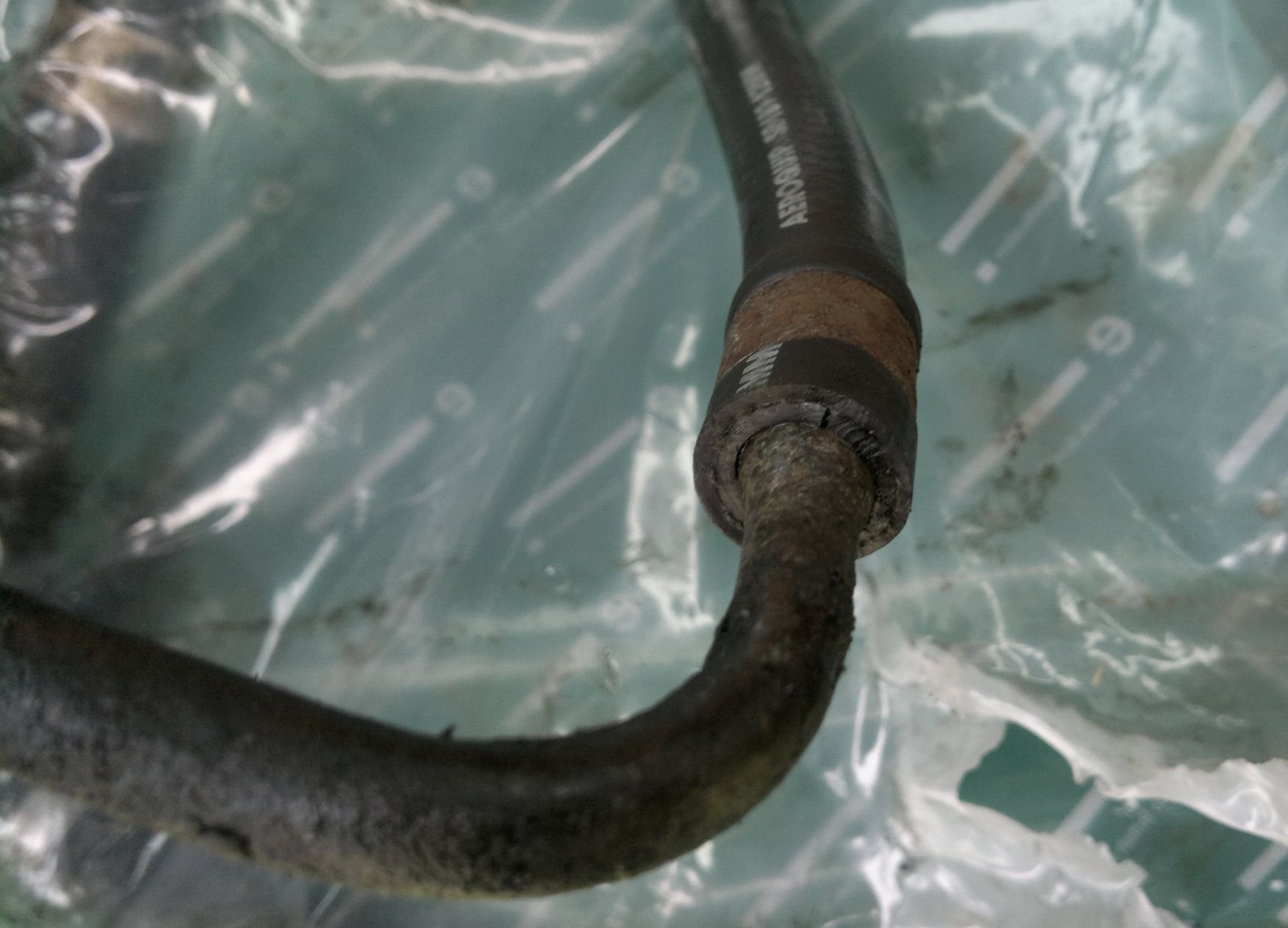Jednou z příčin úniku byla zřejmě vyrezlá a prasklá tlaková hadice pod sponou.