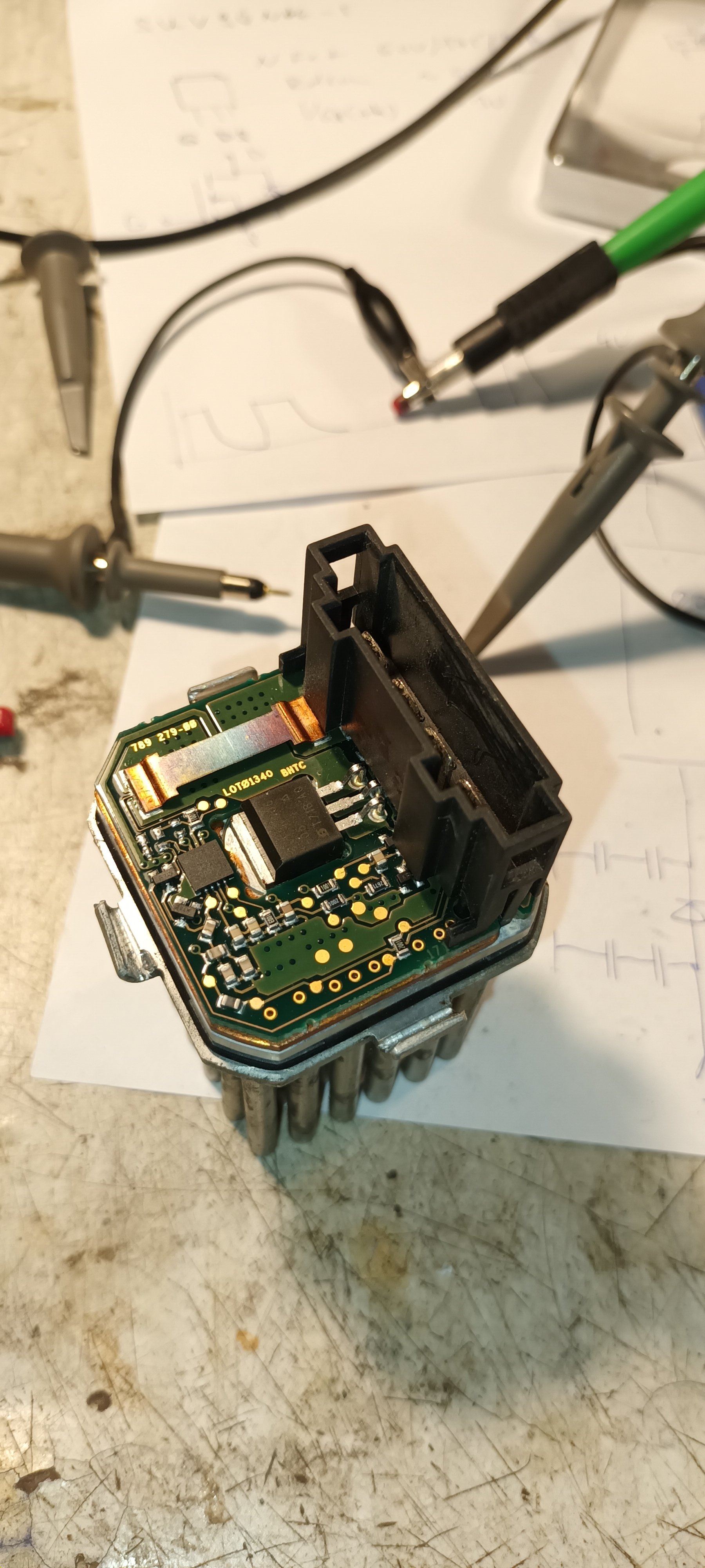 Ježka jsem rozebral, proměřil, rozkreslil schéma a zjistit, že všechno vypadá dobře. Mezitím došly díly, co už se zkoušely, takže zkusit jiného ježka, úplně nového - nefungovalo, změřit odběr ventilátorů - ten v autě 18A, starý vyndaný z auta 19A nový se kterým to také nefungovalo 12A. Rozebrat i druhého ježka - uvnitř úplně stejné, problém nezjištěn.