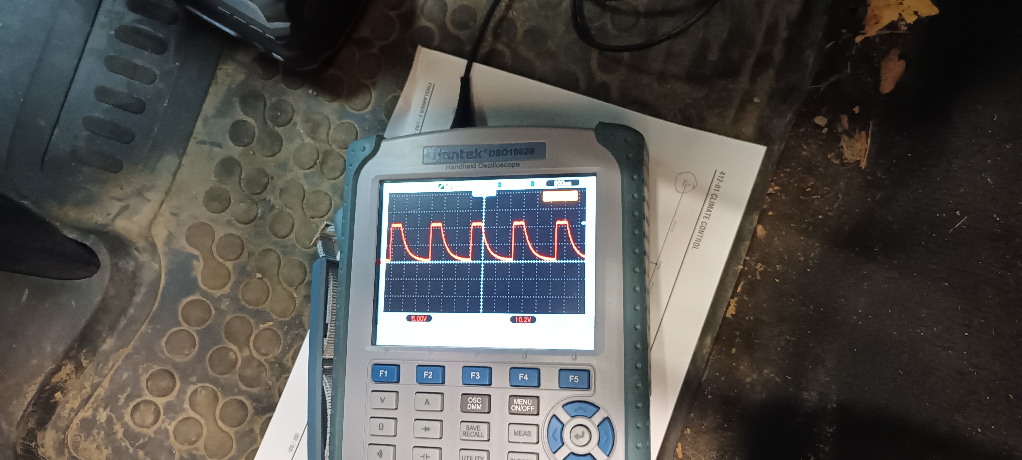 Proběhla kontrola v následujícím pořadí - ventilátor se doopravdy netočí, pojistka ventilátoru je v pořádku a je na ní 12V. Po demontáži plynového pedálu se dalo dostat ke konektoru na regulačním "ježku" (rezistoru) LR002685, propojením příslušných 2 drátů se ventilátor rozběhl, takže alespoň něco funguje. Následně osciloskop a podívat se na ovládací PWM signál z řídícího panelu k "ježku" - je tam a vypadá rozumně. Takže už zbývá jenom vlastní ježek.