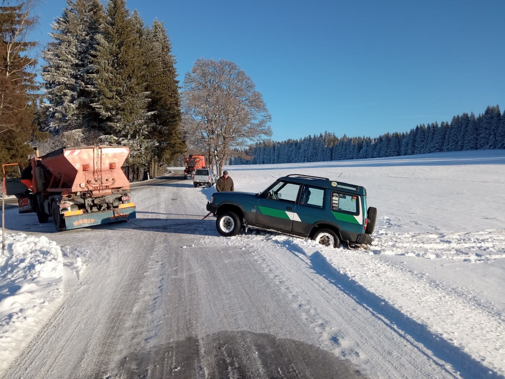 Tuarég odjel, já vyndal kynetickej špagát, a na třetí lehký cuknutí byl venku jako špunt z flašky. :Pohoda: Silnice byla jedno kluziště, tak jen na redukci se špérou lehce jen váhou auta zapérovat na špagátě, ale zase né moc abych mu z toho neudělal dvě :lol: :lol: a druhá možnost pak byl naviják... Ale jen aby mi pak zase nechcípla ta funglovka baterka :lol: :lol: :lol: :lol: