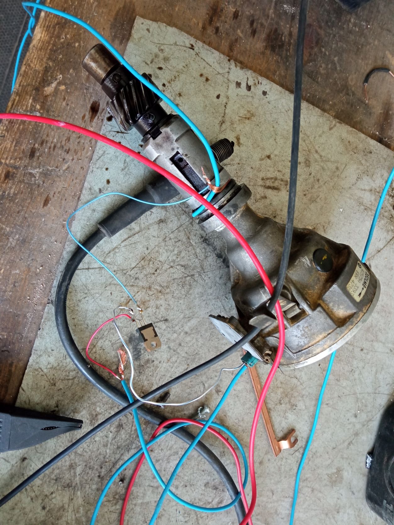 No dobrá, přehodil jsem jen samotnej modul, auto sice chytlo, ale na prd, chcípalo zlobilo... Hodil jsem tam stroboskop, abych viděl jestli jde jiskra, no naprd, přehodil jsem zase starej modul, ten chvíli šel a nebo nešel, takže přehazovačka tam a zpět jeden rozdělovač, pak převod z jednoho rozdělovače na druhej abych měl stejnou polohu palce.... snímací cívka tam a zpět, až jsem si to celý rozjebal na rozvodech a musel jsem jít od základu - značka na řemenici a palec nastavit na první válec... no nervy začínaly téct. Motor několikrát uchcanej, nový svíčky a stále nic. Tak jsem chyt ten starej modul a vykuch jsem mu kryt, lehce jsem jehlou ťuknul o přívody a ejhle, jeden drát se zvednul. Vůbec tam nedržel na plošňáku, tak jsem byl doma. No oprava by byla na 5 minut s pájkou, ale protože to je zajebaný tím polotekutým silikonem, tak je to neopravitelný. Ten modul z novýho rozdělovače je taky v háji, ale abych měl jistotu, mrknul jsem do šuplíku, prdnul jsem tam napřed na stole MOSFETa tranďák jen tak na hulváta jestli to bude jiskřit a jiskřilo, tak jsem to prdnul i s tím hulvátem do auta a motor chytil na brnk.