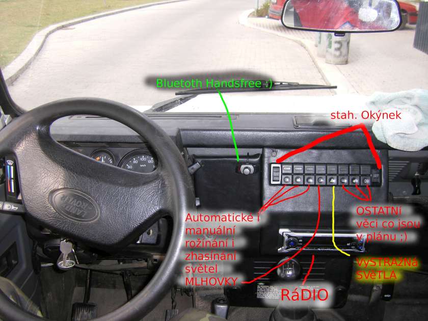 z překlyšky a potažený koženkou cca 12 tlačítek a díra na Rádio jinak z boku jsme daly zásuvku a konektor na dobyjení přez USB ........ skloňování světel jsme daly pod popelník (přece jenom to člověk nepoužívá denně a popelník jde snadno vyndat.... (při tomto bastlení dodělání.... Centrálního zamykání na všech 5ti dveřích, auto. rožínání světel.. a el. otvírání předních okýnek [samozdřejmě že rez ve dveřích byla očištěna a všechno přelakováno, nakonzervováno] zrovna jsme i nachystaly vyhřívání zrcátek + bomba věc MAGIKCAR ...dálkový start...dochlazování turba..atd.. ...pager o stavu auta dosah píšou až 2Km