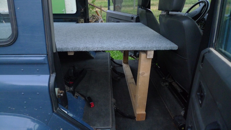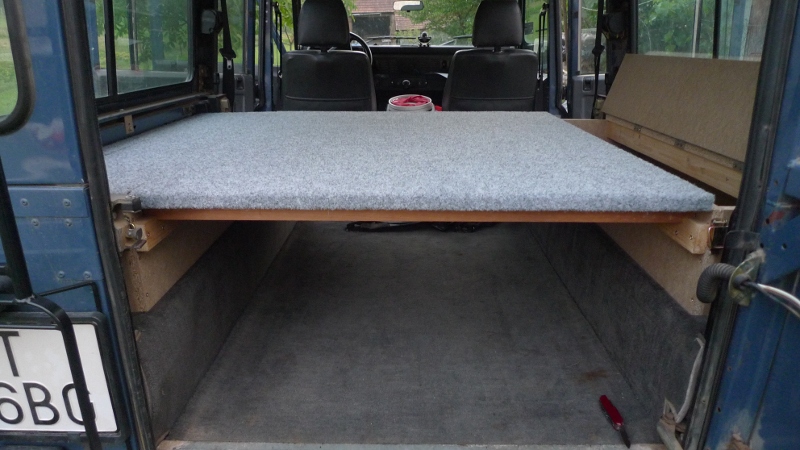 Přední deska je zdvihací, aby se dalo dostat do 'peřińáku¨ který je oddělený od zbytku nákladového prostoru kvůli vodě atd. a po stranách jesou bedny s jídlem, vařičem atd. k čemu se chce dostat spolujezdec za jízdy. Asi by tam měla přibýt lednička časem...