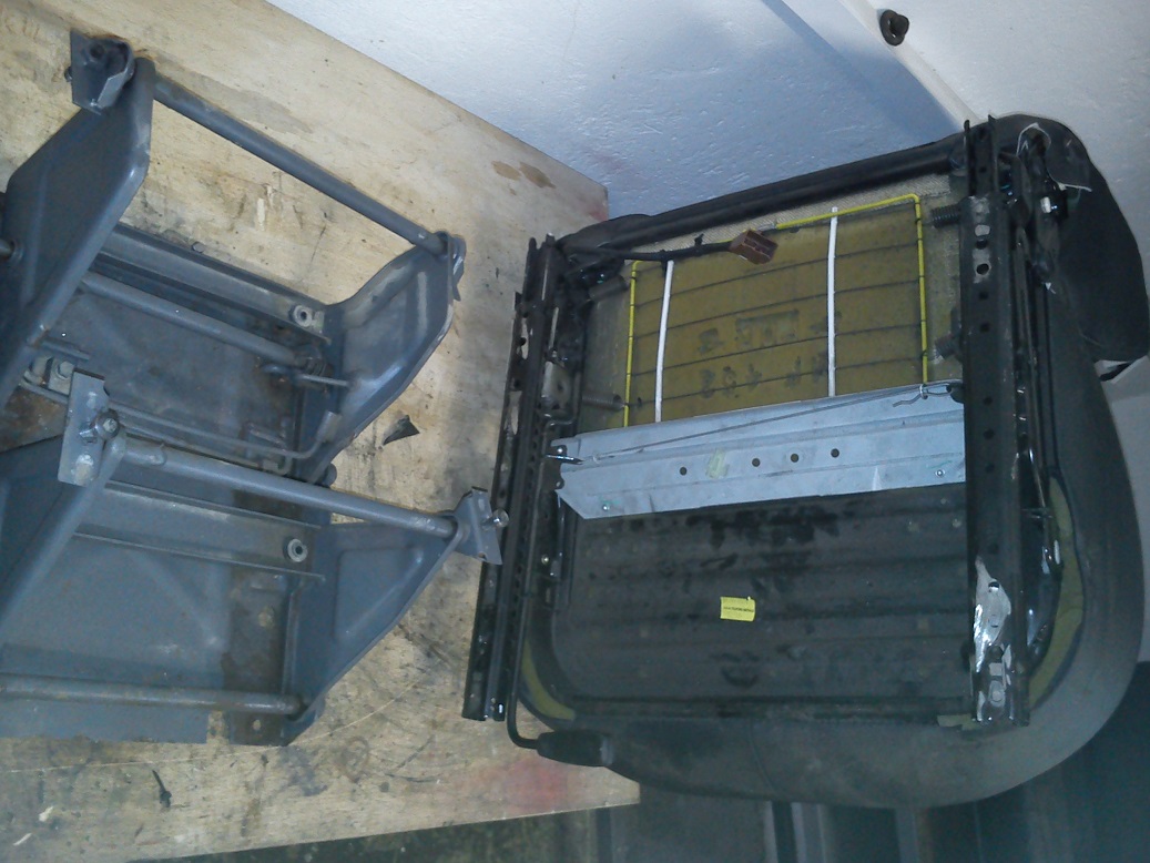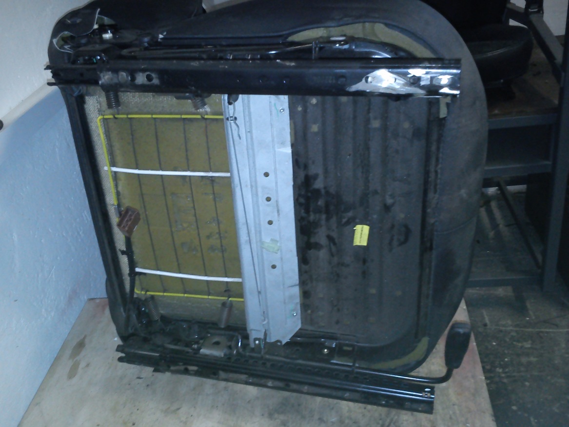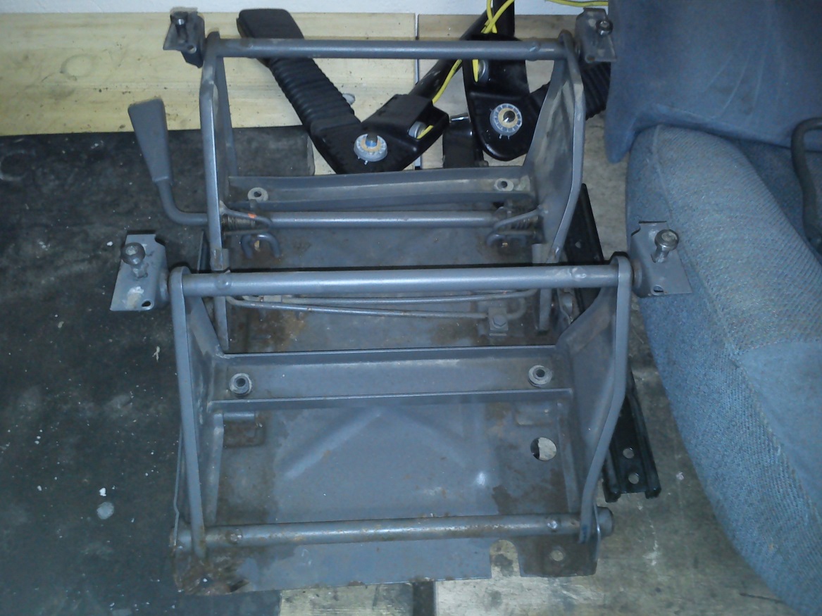 Na třídveřáku je ta koza pod sedačkou, takže jsem tam na dva šrouby chytil sedačku řidiče a podle ní si rozměřím umístění sedačky spolujezdce. Sedačku z D2 chytnu na tu sklápěcí konstrukci přes vingly, které si rozměřím a navařím na pojezdy novýho sedadla a pak sedačku našroubuju do úchytú na sklápěcí konstrukci.