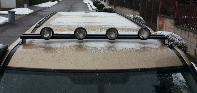 Přesně todle jsem myslel,kdybych měl stan já :Sorry: V krátkých ližinách 2 ks příčníků a vepředu udělaný špešl příčník na to ukotvení,co mám přidělanou tu orig G4 zahrádku :mrgreen: a na něm pod stanem přidělané přídavné světla :yes .