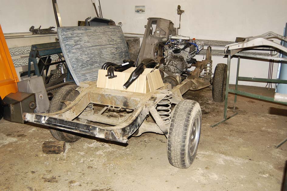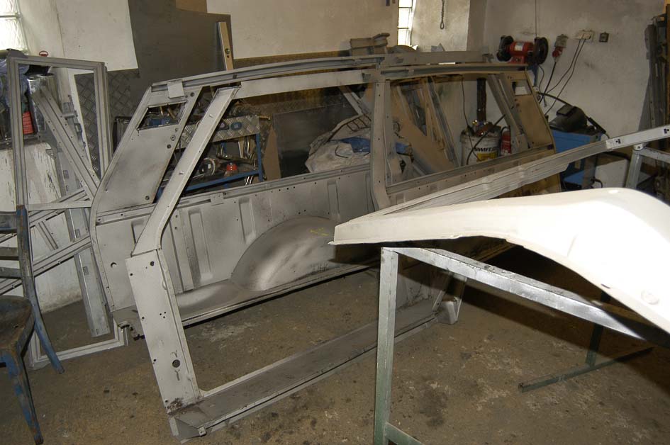 Rangie už je svlečený do naha. Po pravdě pod slušivým kabátkem už to zase tak slavné nebylo (ale není to nijak hrozné). Rám vypadá, že je OK, crossmember pod zadním spodním tailgatem je sežraný, footwells mají také sem tam nějakou tu dírku, stejně jako bulkhead, který je děravý pod čelním oknem. Dáváme dohromady podvozek - vzhledem k tomu, že auto není určeno pro těžký terén, volím standardní žluté pružiny Britpart + nastavitelné tlumiče Koni Heavy Track, polybush kit a ventilované brzdové kotouče EBC. Pak se to všechno zkušebně poskládá s motorem a převodovkou, co bude potřeba, dovaří se a pak hurá na pískování, antikorozní ochranu a povrchovku šasi a rámu karoserie (ještě, že můj Rangie byl vyroben před rokem 85, kdy se přešlo ze šroubování rámu karoserie na vaření - pak by se s tím asi pracovalo o poznání hůř). Jinak skiny obou dveří nejsou nijak krásné - vybublané s vrstvami kitu. Nevíte někdo o nějakých pěkných (připomínám, že je to dvoudvéřák)?