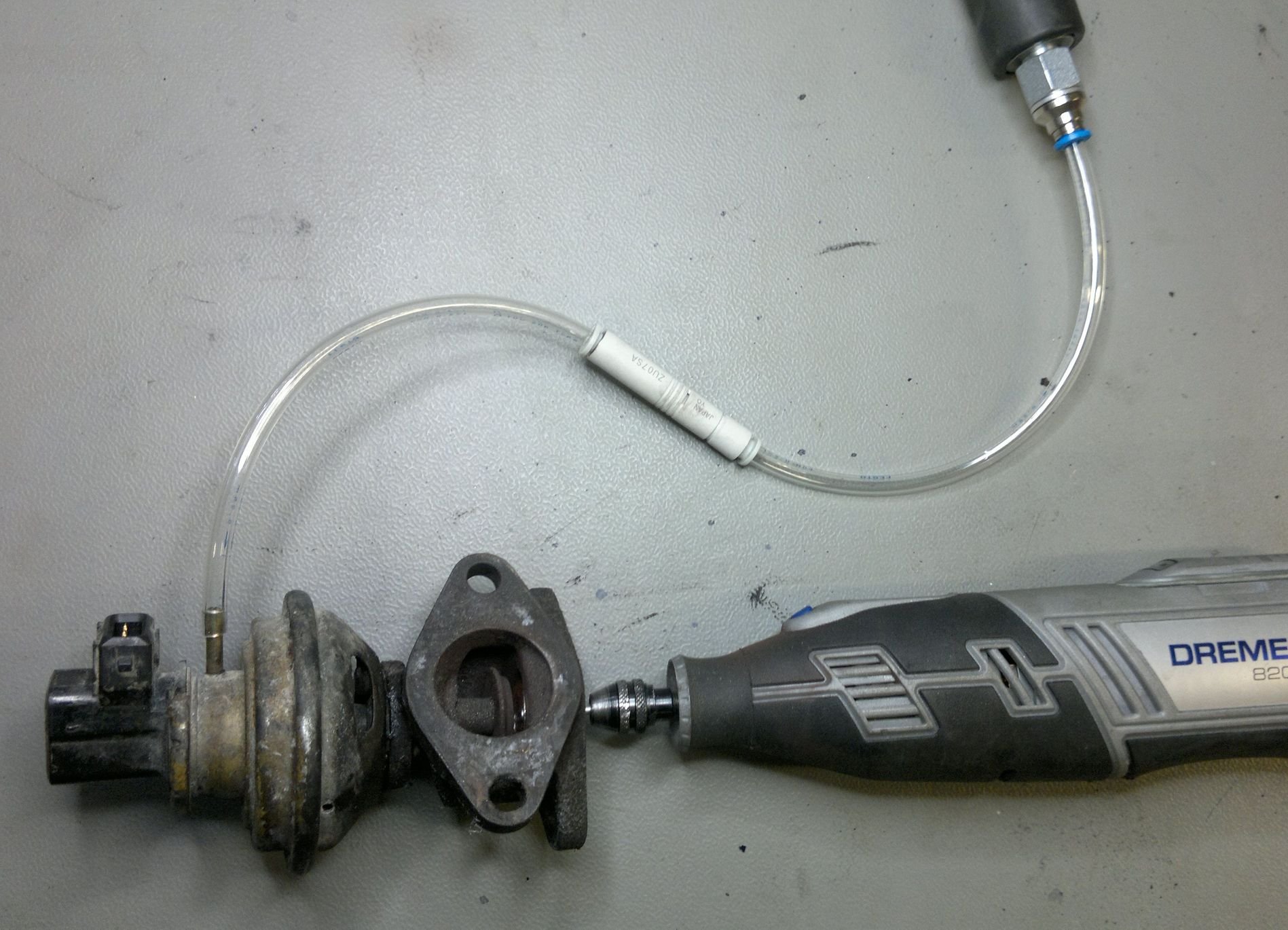 Já už sem si ventil obstaral dříve za účelem jiného experimentování, ale teď přišel k duhu. Asi nejdůležitější je vyčistit sedlo klapky. Ovšem jak jí otevřít, když se ovládá podtlakem ? Mechanické přetlačení odspoda by bránilo použití "čistících" prostředků. Dají se použít třeba ruční podtlakové pumpičky. A nebo malá nenápadná pneumatická součástka - generátor (či ejektor) vakua. Já použil model od SMC ZU07. Na vyčištění jsem použil mini nástroje od Dremelu.