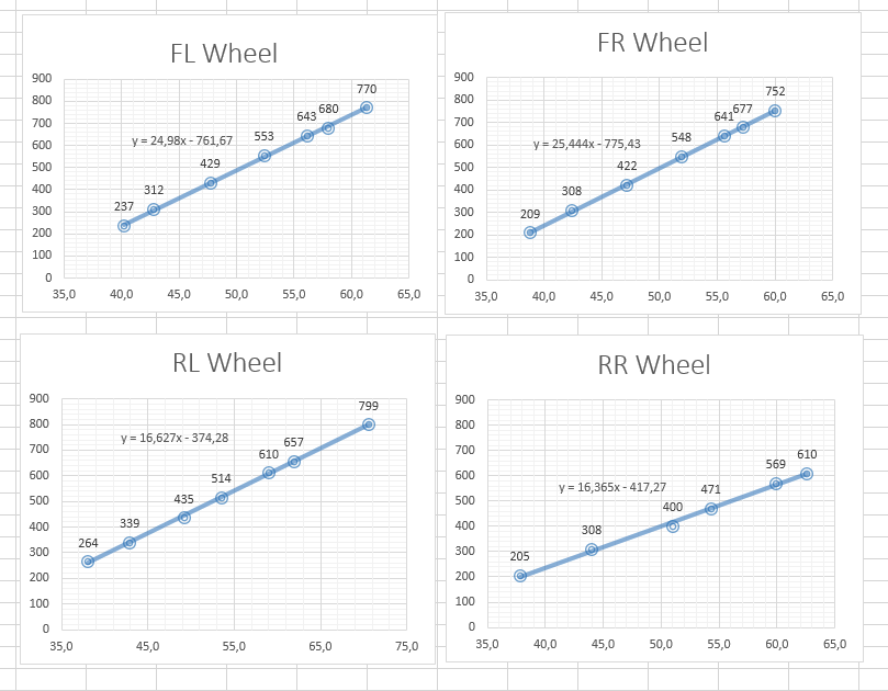 Výstup z čidel je definitivně stejnosměrný napětí 0-5V, resp asi 1-4V v rozsahu špalky - max. vyvěšení kola. Lineární průběh. Překvapení, které je ale vlastně zcela logické, že "strmost" křivky je jiná vepředu a vzadu.
