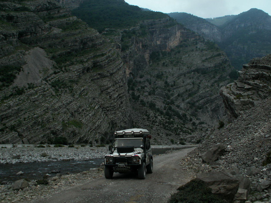 Nase expedice o sile 7 Defenderu a 2 Disco 2 se pysne prodirala horskou kamenitou extremni cestou, kde nas pruvodce tvrdil, ze se tam da dostat jen helikopterou....vsichni jsme meli nervy nadranc....mozna tu pujde o zivot... skoda,ze to netoci CNN.... ty zabery padajiciho auta ze skaly etc a pak proti nam vyjela albanska offroad technika- Mercedes 123 a mystrnne se nam na uzke cesticce vyhl
