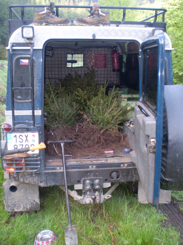 Dva pomocníci při sázení smrku. Jeden teda spolehlivě naloží, doveze a odveze. Druhej dělá že něco dělá, ale přitom jen kouká kde se co šustne a sázet musim sám :D